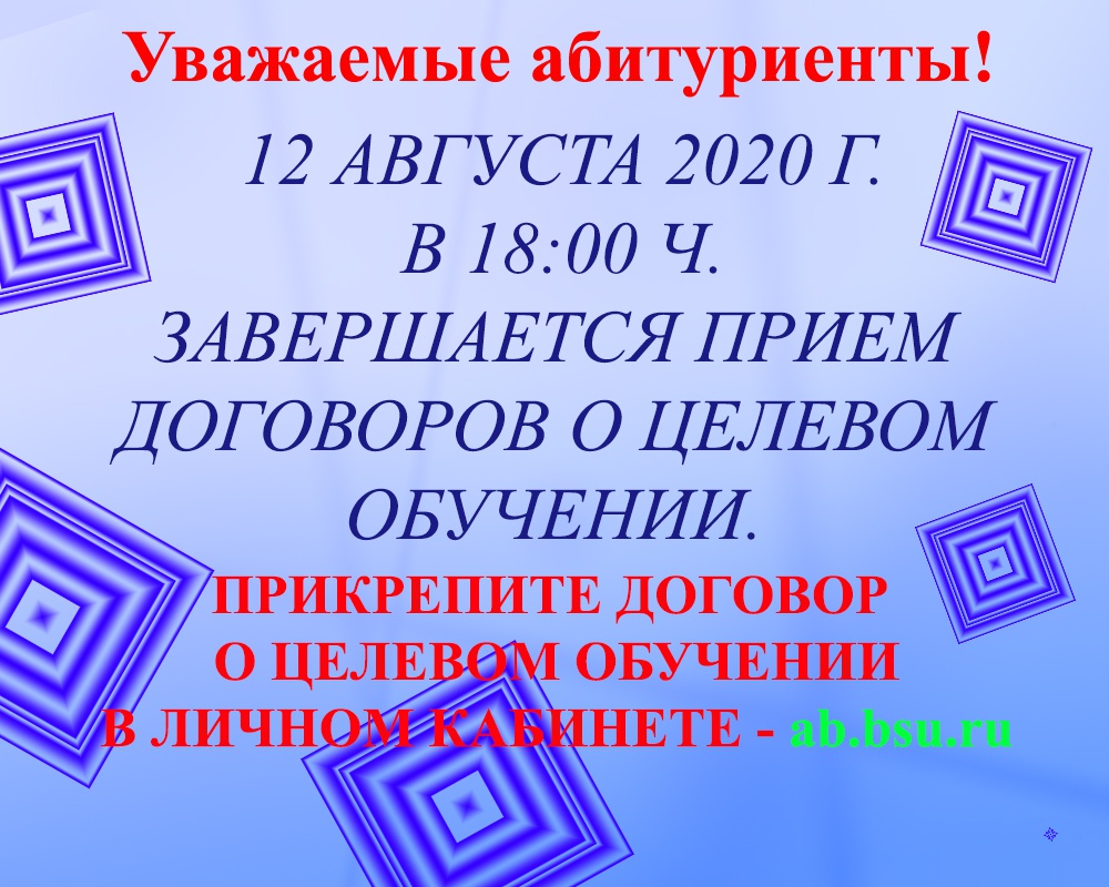Уважаемые абитуриенты! Прием договоров о целевом обучении завершается 12 августа в 18:00 ч. Просим прикрепить скан договора (формат PDF) в личном кабинете ab.bsu.ru