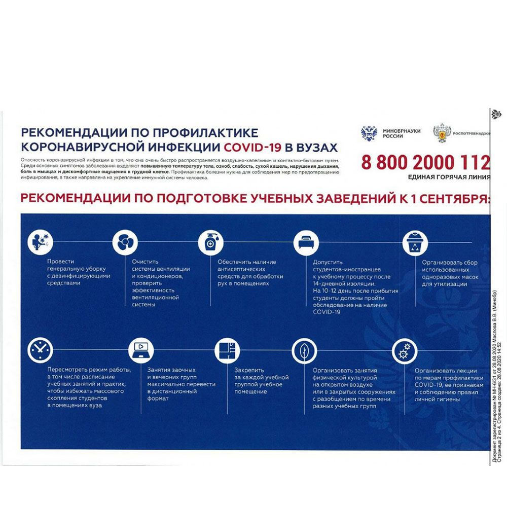 Министерство науки и высшего образования Российской Федерации совместно с Роспотребнадзором подготовили рекомендации по профилактике коронавирусной инфекции COVID-19 в образовательных организациях высшего образования в новом учебном году.