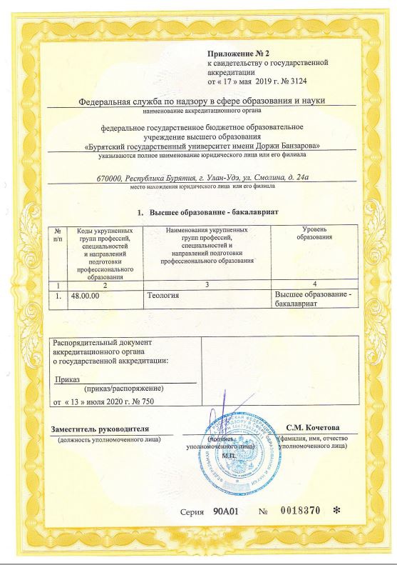 Приказом Федеральной службы по надзору в сфере образования и науки №750 от 13 июля 2020 г. выдано Приложение №2 к свидетельству о государственной аккредитации образовательной деятельности ФГБОУ ВО "Бурятский государственный университет имени Доржи Банзарова".