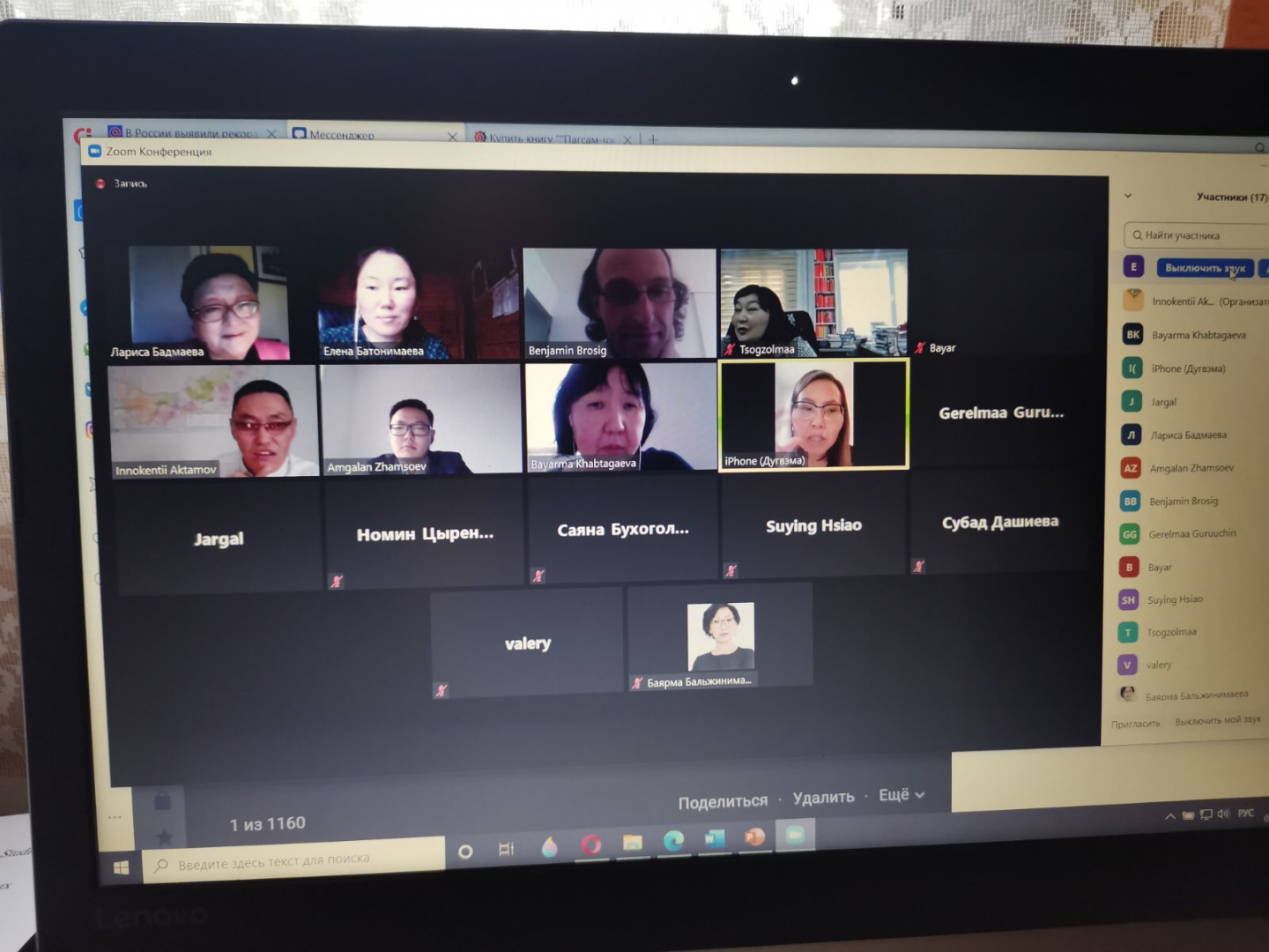 В течение 3 дней на онлайн заседаниях следующих 6 секций: «Письменные системы монгольских народов и письменные памятники на монгольских языках: вопросы лингвистического и филологического изучения», «Фонологические и грамматические системы монгольских языков в диахронической, структурной и функциональной перспективе», «Языковые контакты монгольских народов и их отражения в лексике и грамматике», «Лексикологические и лексико-семантические исследования монгольских языков», «Универсальное и национальное в монгольских языковых картинах мира: когнитивные и этнолингвистические подходы», «Социолингвистические исследования и актуальные вопросы преподавания монгольских языков» представили свои научные доклады, поделились результатами своих изысканий свыше 100 участников из 9 стран (России, Китая, Монголии, Германии, Венгрии, Италии, Японии, Турции, Тайваня, Гонконга, Казахстана).