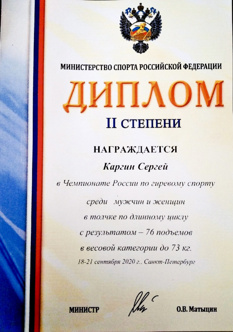 - II место в Чемпионате России по гиревому спорту среди мужчин и женщин в толчке по длинному циклу с результатом – 76 подъемов в весовой категории до 73 кг (18-21 сентября 2020 г., г. Санкт-Петербург) и