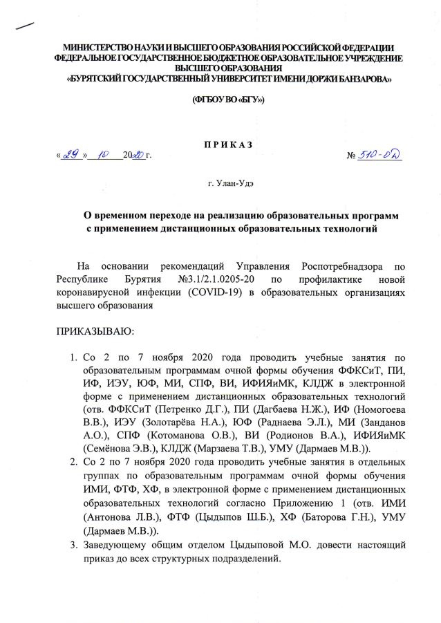 1. Со 2 по 7 ноября 2020 года проводить учебные занятия по образовательным программам очной формы обучения ФФКСиТ, ПИ, ИФ, ИЭУ, ЮФ, МИ, СПФ, ВИ, ИФИЯиМК, КЛДЖ в электронной форме с применением дистанционных образовательных технологий (отв. ФФКСиТ (Петренко Д.Г.), ПИ (Дагбаева Н.Ж.), ИФ (Номогоева В.В.), ИЭУ (Золотарёва Н.А.), ЮФ (Раднаева Э.Л.), МИ (Занданов А.О.), СПФ (Котоманова О.В.), ВИ (Родионов В.А.), ИФИЯиМК (Семёнова Э.В.), КЛДЖ (Марзаева Т.В.), УМУ (Дармаев М.В.)).