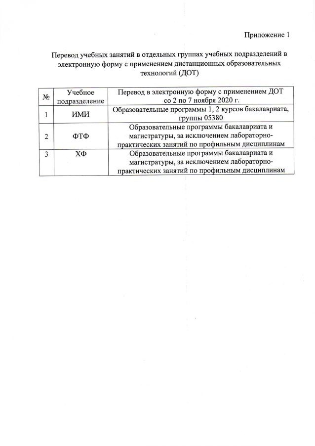 2. Со 2 по 7 ноября 2020 года проводить учебные занятия в отдельных группах по образовательным программам очной формы обучения ИМИ, ФТФ, ХФ, в электронной форме с применением дистанционных образовательных технологий согласно Приложению 1 (отв. ИМИ (Антонова Л.В.), ФТФ (Цыдыпов Ш.Б.), ХФ (Баторова Г.Н.), УМУ (Дармаев М.В.)).