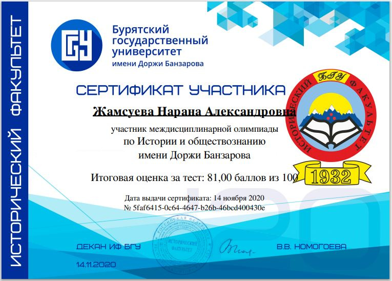 14 ноября 2020 г. на историческом факультете Бурятского государственного университета им. Доржи Банзарова состоялась традиционная олимпиада по истории и обществознанию им. Доржи Банзарова. В олимпиаде приняло участие 370 участников, представлявших школы и ссузы Бурятии. Участникам в дистанционном режиме предстояло выполнить 50 заданий по всеобщей и отечественной истории и обществознанию. По итогам работы призовые места получили: