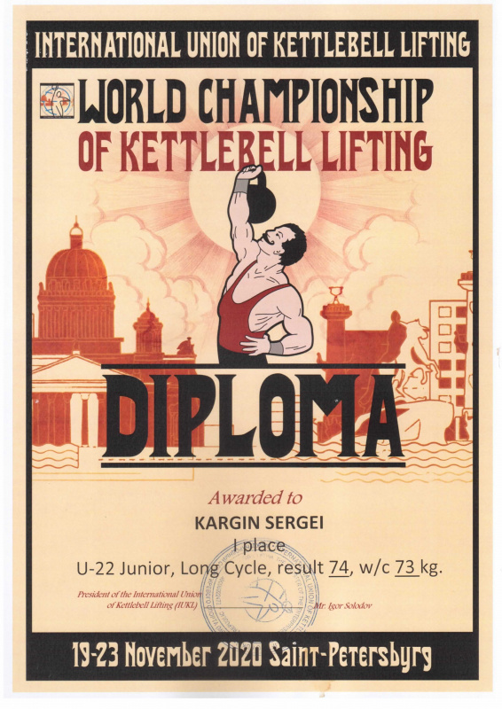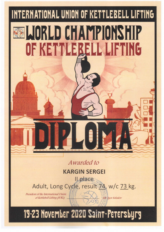 - II место в Чемпионате мира по гиревому спорту среди мужчин и женщин в толчке по длинному циклу с результатом – 74 подъемов в весовой категории 73 кг (19-23 ноября 2020 г., г. Санкт-Петербург)