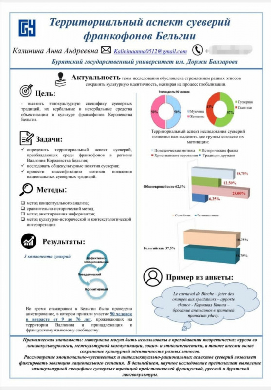 Калинина А. А., аспирант 3го курса стала победителем 1го заочного этапа на базе Бурятского государственного университета им. Доржи Банзарова, 2го этапа в г. Тверь и финалистом 3 этапа в г. Москва. 1 декабря в Московском авиационном институте на V Всероссийском научном форуме «Наука будущего- наука молодых» Калинина А. А. выступила с постерным докладом «Территориальный аспект суеверий франкофонов Бельгии» в секции «Взаимодействия с применением гуманитарных дисциплин». Доклад получил положительные отзывы.