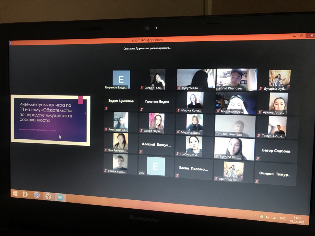 8 декабря 2020 года на юридическом факультете Бурятского государственного университета состоялась интеллектуальная игра по гражданскому праву на тему "Обязательства по передаче имущества в собственность", организованная в рамках Байкальской юридической декады на открытом занятии старшего преподавателя кафедры гражданского права и процесса Чмелёвой Татьяны Анатольевны.