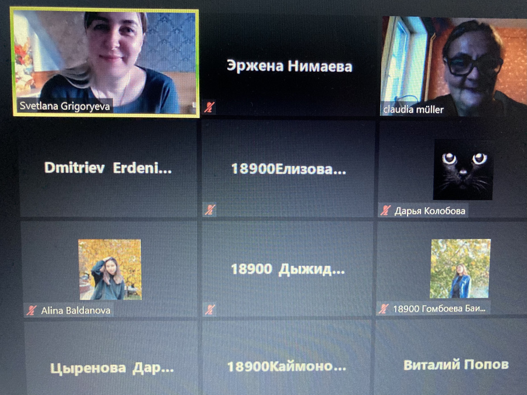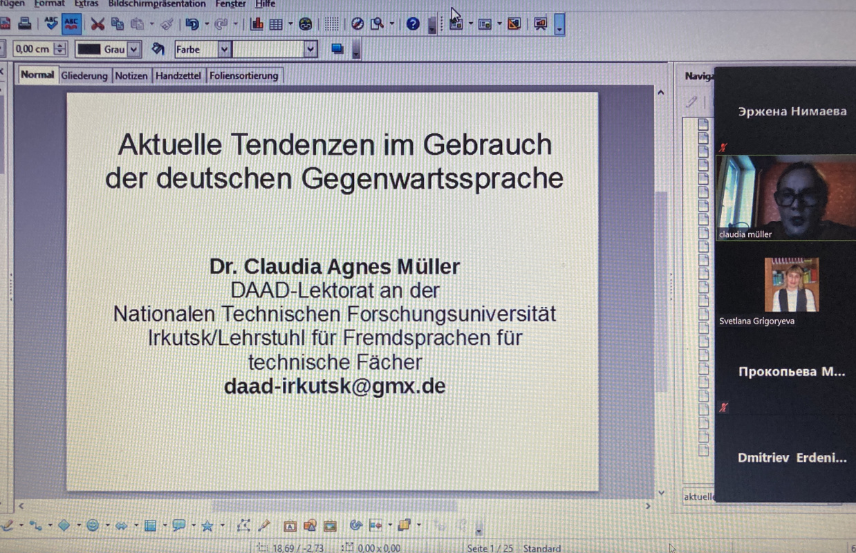 9 декабря состоялась онлайн-лекция лектора Германской службы академических обменов (DAAD) г. Иркутск Клаудии Мюллер "Aktuelle Tendenzen im Gebrauch der deutschen Gegenwartssprache" (Актуальные тенденции в использовании современного немецкого языка). Онлайн-лекция была организована кафедрой немецкого и французского языков в рамках недели немецкого языка для студентов немецкого-английского отделения, обучающихся по программам "Педагогическое6 образование" и "Лингвистика".