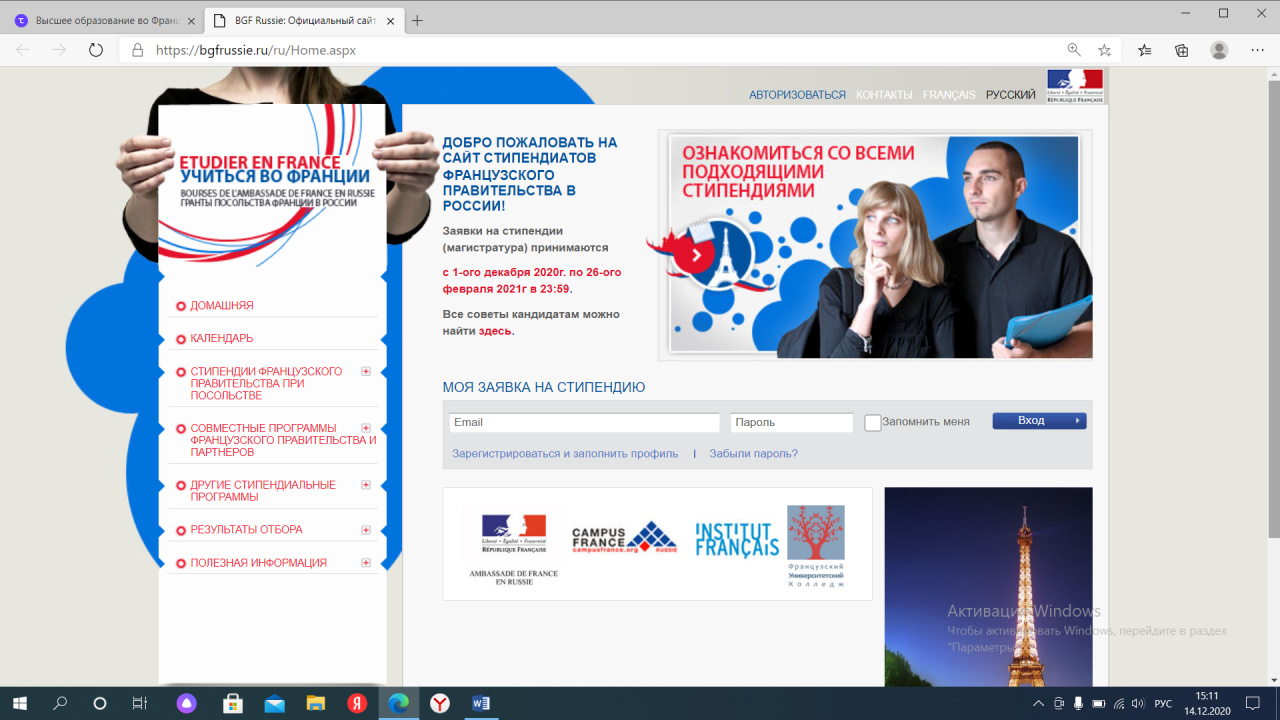 1. Посольство Франции в России открывает конкурс стипендий студентам-гражданам РФ, зачисленным или находящимся в процессе зачисления в высшее учебное заведение Франции на 2021-22 учебный год (запись должна быть как минимум на магистерскую программу обучения).
