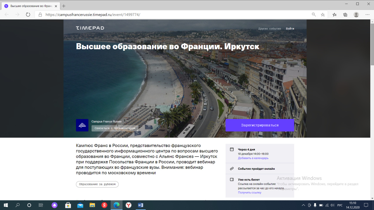 Участие в вебинаре бесплатное, но предварительная регистрация обязательна: Высшее образование во Франции. Иркутск (timepad.ru).