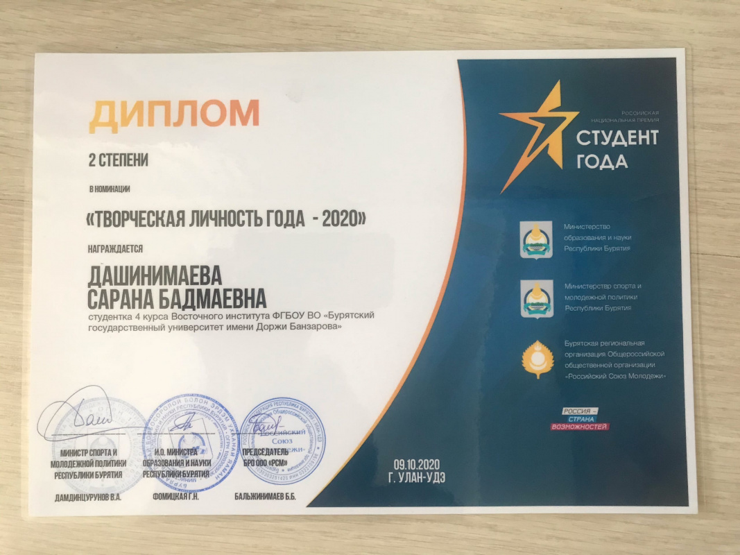 По итогам конкурсных испытаний регионального этапа премии в номинации "Творческая личность года" студентка 4 курса Восточного института БГУ - Сарана Дашинимаева получает диплом 2 степени.