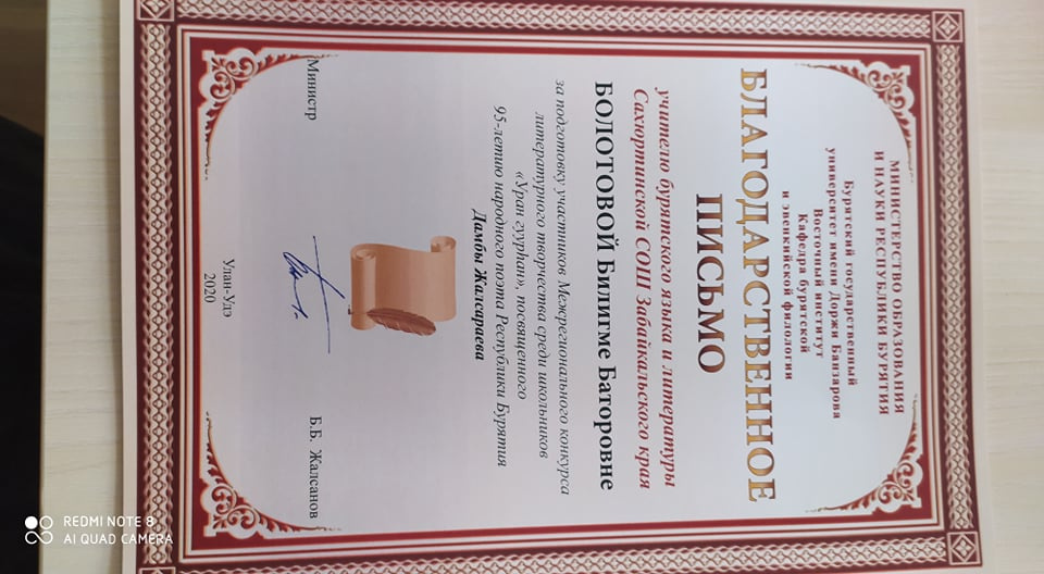 В конце декабря 2020 г. подведены итоги Межрегионального конкурса литературного творчества среди школьников на бурятском языке «Уран гуурhан», посвященного 95-летию Народного поэта Республики Бурятия Дамбы Жалсараева. Конкурс проводится с 2017 года ежегодно в рамках реализации госпрограммы «Сохранение и развитие бурятского языка на 2014-2020 годы», посвящается юбилеям бурятских писателей и призван выявить литературно одаренную молодежь, стимулировать ее дальнейшее творческое развитие. С 2018 года конкурс имеет статус межрегионального конкурса, в котором принимают участие школьники 9-11 классов Республики Бурятия, Агинского Бурятского округа Забайкальского края, Усть-Ордынского Бурятского округа Иркутской области. Организаторы конкурса - Министерство образования и науки Республики Бурятия, кафедра бурятской и эвенкийской филологии ФГБОУ ВО «Бурятский государственный университет имени Доржи Банзарова».