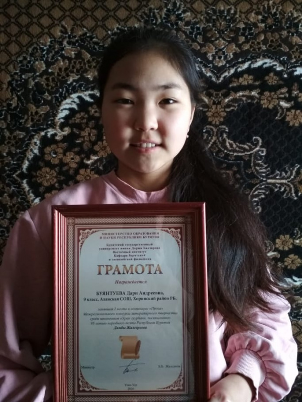 1 место - Буянтуева Дари Андреевна, 9 класс, Аланская СОШ, Хоринский район РБ (4 рассказа)
