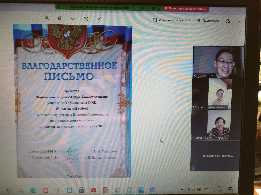 30 декабря 2020 г. подведены итоги III заочной республиканской олимпиады по страноведению Монголии-2020 "Удивительная и загадочная Монголия". Олимпиада традиционно проводится среди школьников средних общеобразовательных школ и учащихся средних специальных учебных заведений г. Улан-Удэ и Республики Бурятия. Как правило, мероприятие проходит в два этапа с заданиями, направленными на развитие творческих способностей и познавательной деятельности участников, на развитие интереса к познанию духовных ценностей, культуры и традиций монголоязычных народов (монголов, бурят, калмыков).
