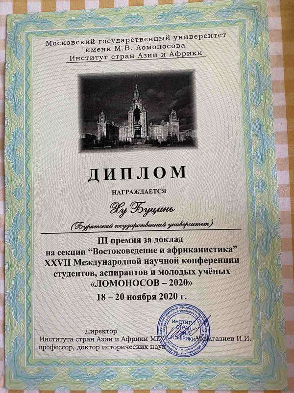 Аспирант 3 года обучения кафедры филологии Центральной Азии Ху Буцинь выступил с докладом "Именные формулы монгольского языка Внутренней Монголии и бурятского языка: коммуникативная функция" на заседании подсекции «Лингвистика – языки стран Ближнего и Среднего Востока, Кавказа и Центральной Азии, Африки и Южной Азии». Доклад вызвал живой интерес у членов жюри и участников заседания. Научная работа нашего аспиранта стала одним из лучших докладов, прозвучавших на подсекции. По итогам конференции доклад Ху Буциня был удостоен III премии подсекции "Лингвистика – языки стран Ближнего и Среднего Востока, Кавказа и Центральной Азии, Африки и Южной Азии" секции "Востоковедение и африканистика". Научный руководитель - к.филол.н., доцент Н. Б. Бадмацыренова.