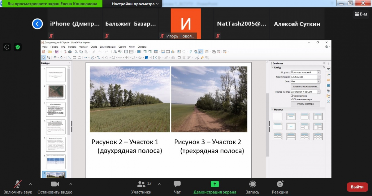 И, наконец, особенности трансформации растительного покрова были раскрыты в следующих докладах: Гладинова А.Н., к.г.н., доц. кафедры лесоводства и лесоустройства, Коноваловой Е.В., к.с.-х.н., доц. кафедры лесоводства и лесоустройства, Содбоевой С.Ч., ст.преп. кафедры лесоводства и лесоустройства БГСХА «Анализ состояния защитных лесополос в Бичурском районе Республики Бурятия»; Суткина А.В., к.б.н., н.с. лаборатории флористики и геоботаники ИОЭБ СО РАН, Краснопевцевой А.С., к.б.н., с.н.с. Байкальского биосферного заповедника, Гамовой Н.С., к.б.н., н.с. Байкальского биосферного заповедника «Чужеродные виды на заповедных территориях (на примере Байкальского биосферного заповедника)»; Гладинова А.Н., к.г.н., доц. кафедры лесоводства и лесоустройства, Коноваловой Е.В., к.с.-х.н., доц. кафедры лесоводства и лесоустройства, Содбоевой С.Ч., ст.преп. кафедры лесоводства и лесоустройства БГСХА «Оценка рекреационного использования лесных насаждений зелёной зоны г. Улан-Удэ»; Ловцовой Н.М., к.б.н., доц., БГУ «Эколого-биологические аспекты использования ильма в озеленении урбанизированных территорий Забайкалья»; Басхаевой Т.Г., к.б.н., доц., зав. каф. ботаники БГУ «Газоны г. Улан-Удэ: современное состояние, проблемы и пути решения».