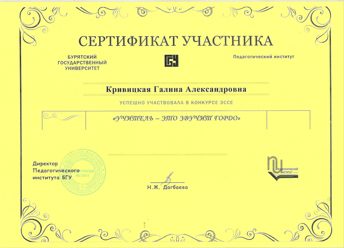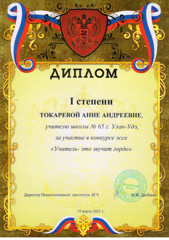 23 марта 2021 г. были подведены итоги конкурса эссе «Учитель – это звучит гордо», проведенного кафедрой филологического и художественно-эстетического образования Педагогического института БГУ в рамках профориентационных мероприятий. В конкурсе приняли участие учителя, школьники и студенты педагогического колледжа г. Улан-Удэ.