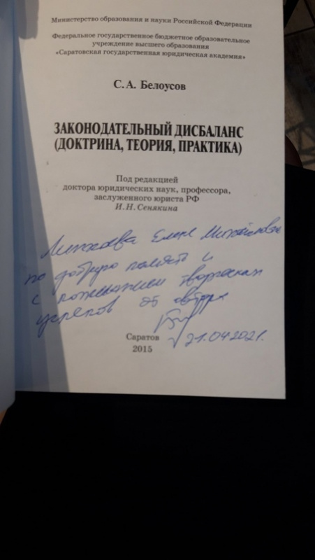А уже 22 апреля студентка 4 курса Елена Линхоева приняла очное участие в крупном молодежном юридическом форуме "Юридическая наука и правоприменение: взгляд молодых ученых", посвященном 90-летнему юбилею СГЮА и собравшем сильнейших студентов-юристов с вузов всей страны. По итогам выступления Елены и последовавшей дискуссии жюри присудило студентке БГУ им ю Д. Банзарова 2 место. Доклад Елены по противодействию ятрогенной преступности был лично отмечен проректором по научной работе СГЮА – профессором, д.ю.н. Сергеем Александровичем Белоусовым, который вручил автору свою книгу с дарственной надписью! Научным руководителем призеров является к.ю.н., доцент Э.Л. Раднаева.