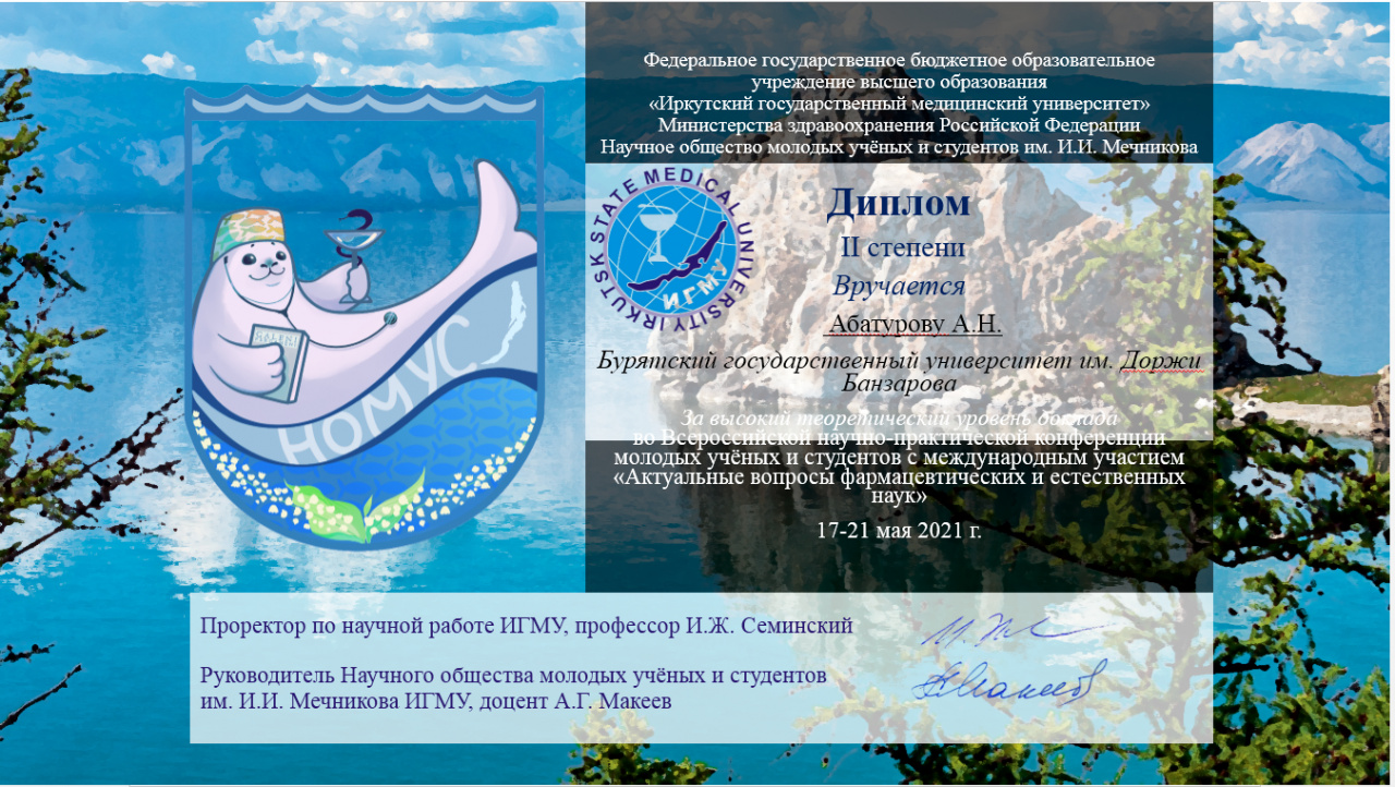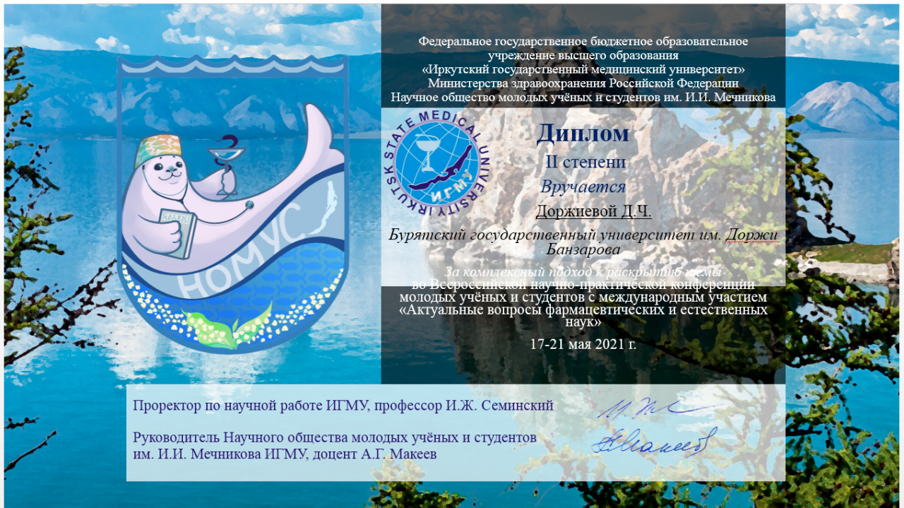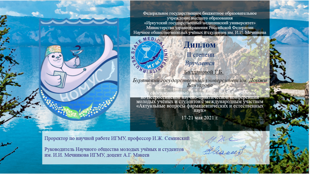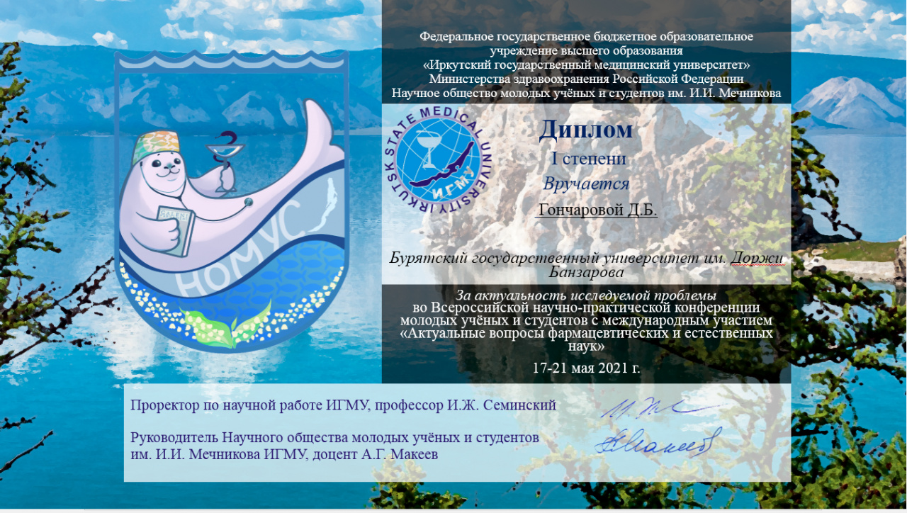 В этом году конференция проходила в режиме online, на платформе Zoom. В рамках мероприятия были представлены стендовые и устные доклады. По результатам конференции Гончарова Даная в номинации "За актуальность исследуемой проблемы" награждена дипломом I степени, Балданова Гыма в номинации "За содержательный анализ исследуемой проблемы", Доржиева Дарима в номинации "За комплексный подход к раскрытие темы" и Абатуров Артем в номинации "За высокий теоретический уровень доклада" награждены дипломами II степени.