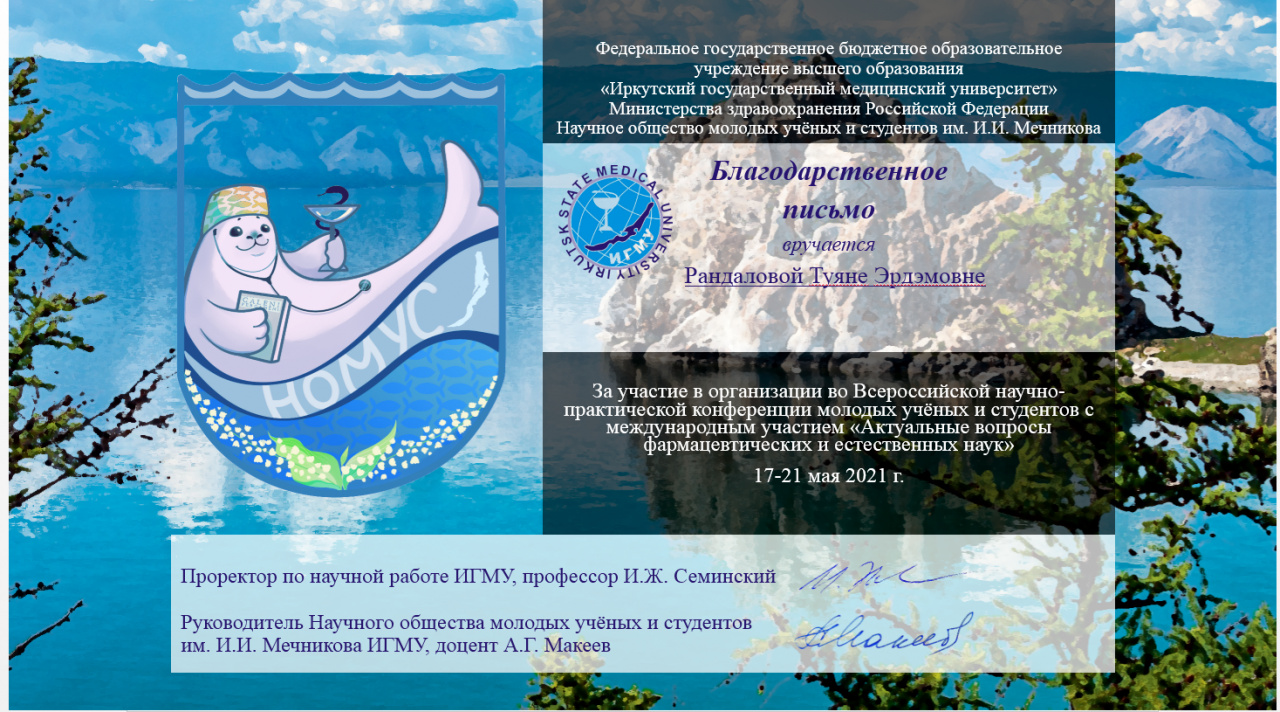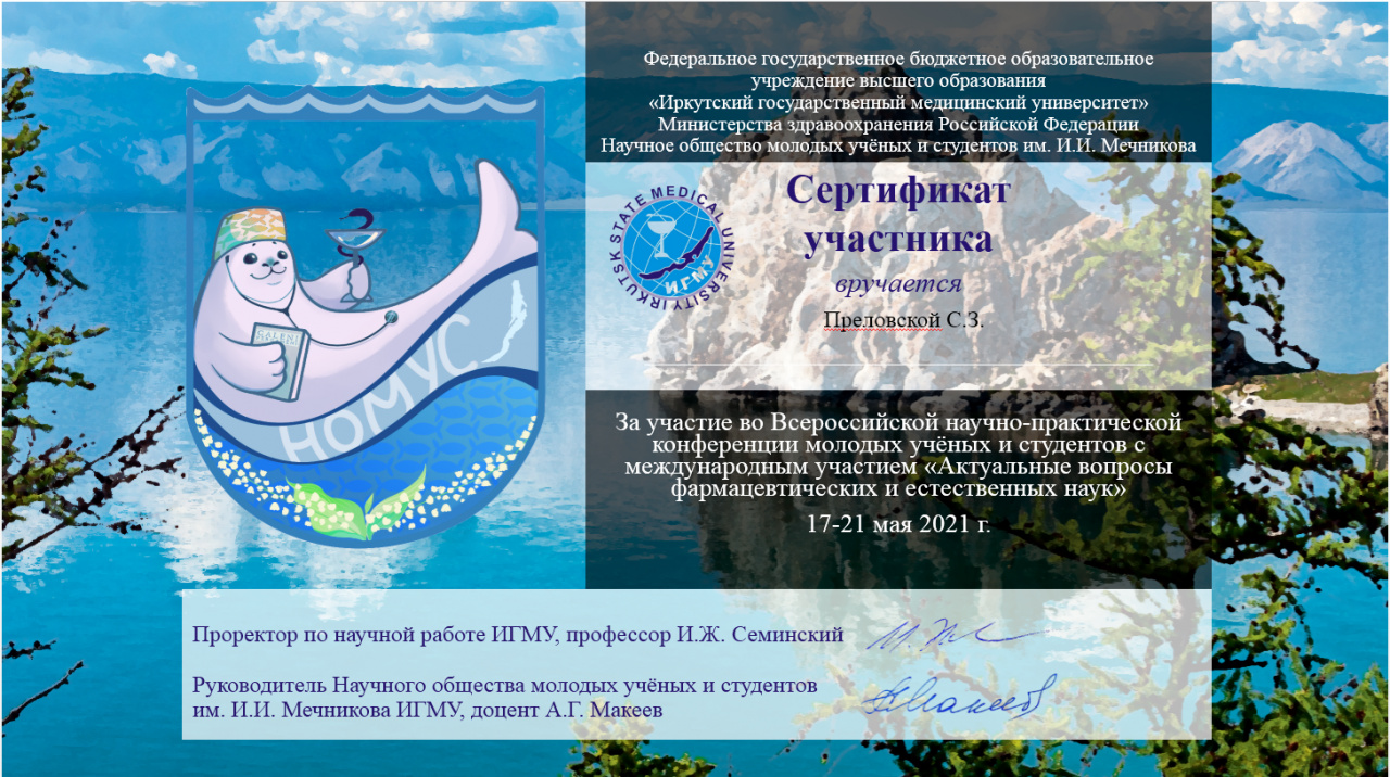 17-21 мая 2021 года прошла Всероссийская научно-практическая конференция молодых ученых и студентов с международным участием "Актуальные вопросы фармацевтических и естественных наук", организованная Иркутским государственным медицинским университетом. В конференции участвовали студенты Медицинского института специальности "Фармация":