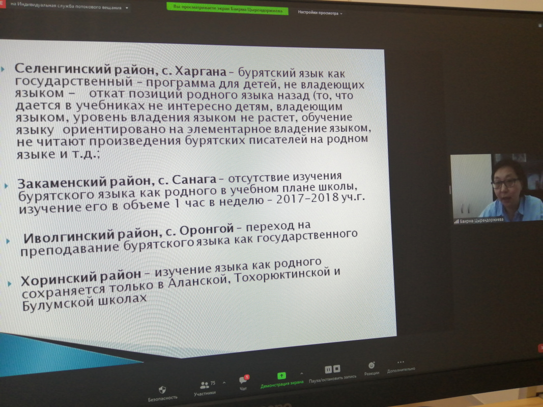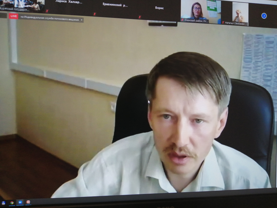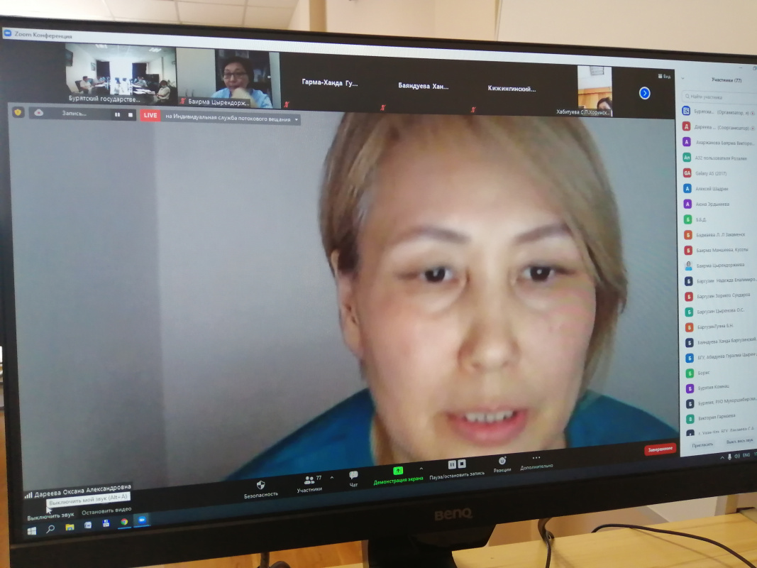23 июня в БГУ на платформе ZOOM прошёл Республиканский методический онлайн-семинар по разработке районных муниципальных программ «Развитие территориального билингвизма и ревитализации бурятского языка» с участием представителей 14 муниципальных образований РБ. Всего в мероприятии приняли участие 77 человек.