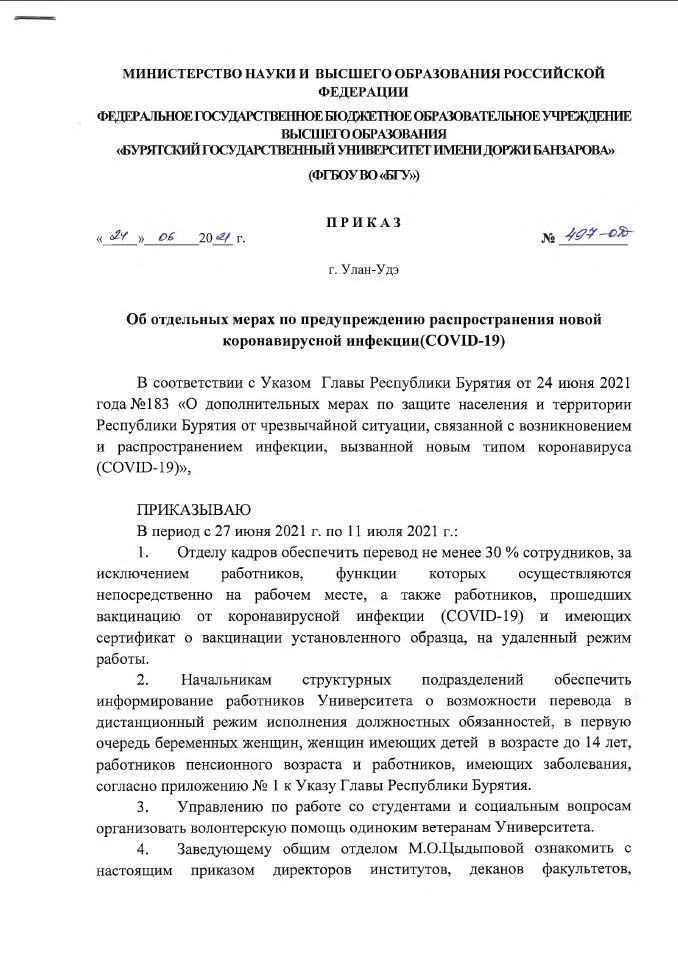 Просим ознакомиться с Приказом № 497-ОД от 24.06.2021 г. "О отдельных мерах по предупреждению распространения новой коронавирусной инфекции (COVID-19)" ссылка на приказ - https://www.bsu.ru/content/page/24872/prikaz-497-od.pdf