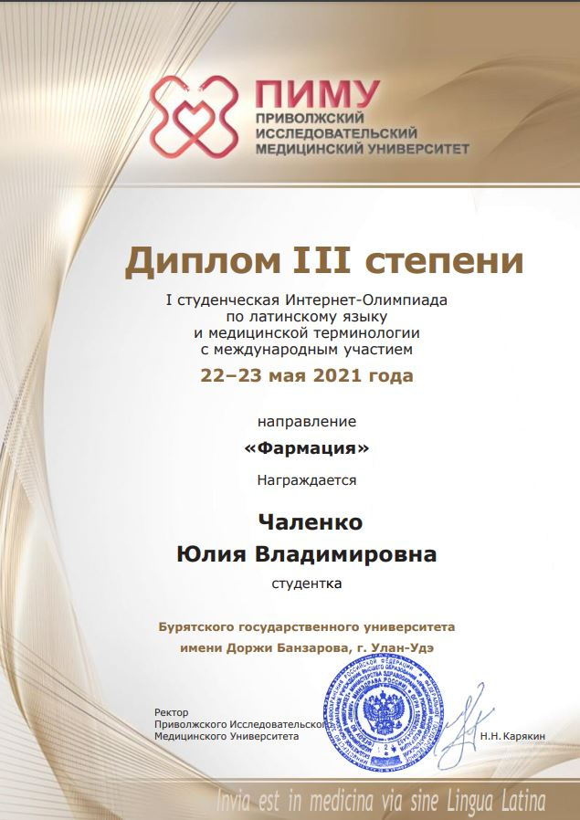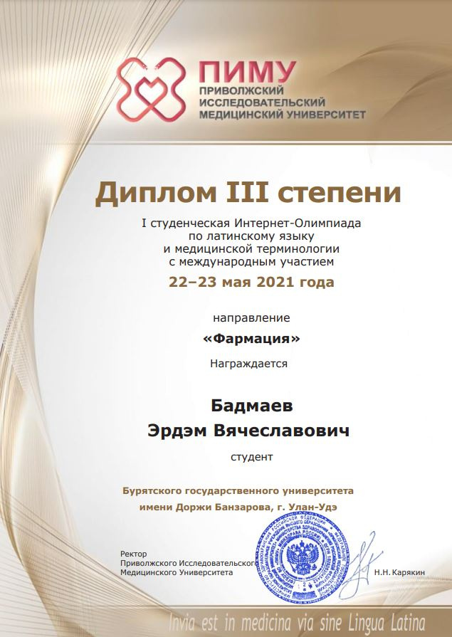 I Интернет-Олимпиада по латинскому языку и медицинской терминологии с международным участием проводилась на базе Приволжского исследовательского медицинского университета с 22-23 мая (г. Нижний Новгород). Олимпиада насчитывала около 400 участников из 18 медицинских и фармацевтических ВУЗов России, Беларуси, Узбекистана. Студенты Медицинского института БГУ приняли активное участие в олимпиаде и стали призерами по направлению «Фармация». Дипломом II степени награждена Батомункуева Янжима (гр.14201). Дипломы III степени получили: Бадмаев Эрдэм (гр.14201), Бабкина Светлана (гр.14202), Чаленко Юлия (гр.14202). Все призеры готовились к Олимпиаде и учатся под руководством доцента кафедры НФЯЗ Карбаиновой М.Ю.