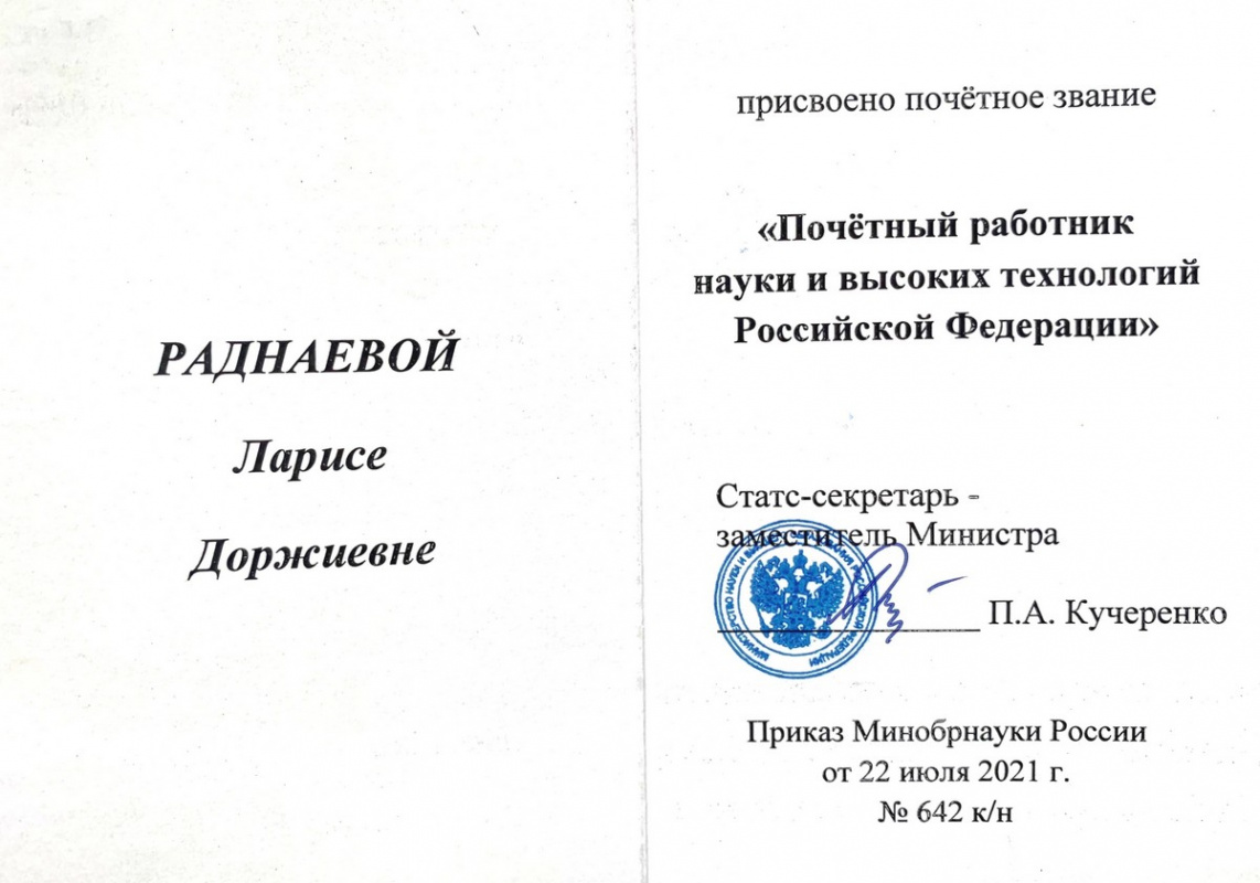 От всей души поздравляем д.х.н., профессора, заведующего кафедрой фармации Медицинского института Раднаеву Ларису Доржиевну с присвоением почетного звания – «Почетный работник науки и высоких технологий Российской Федерации» (Приказ Министерства науки и высшего образования Российской Федерации от 22 июля 2021 года № 642 к/н).