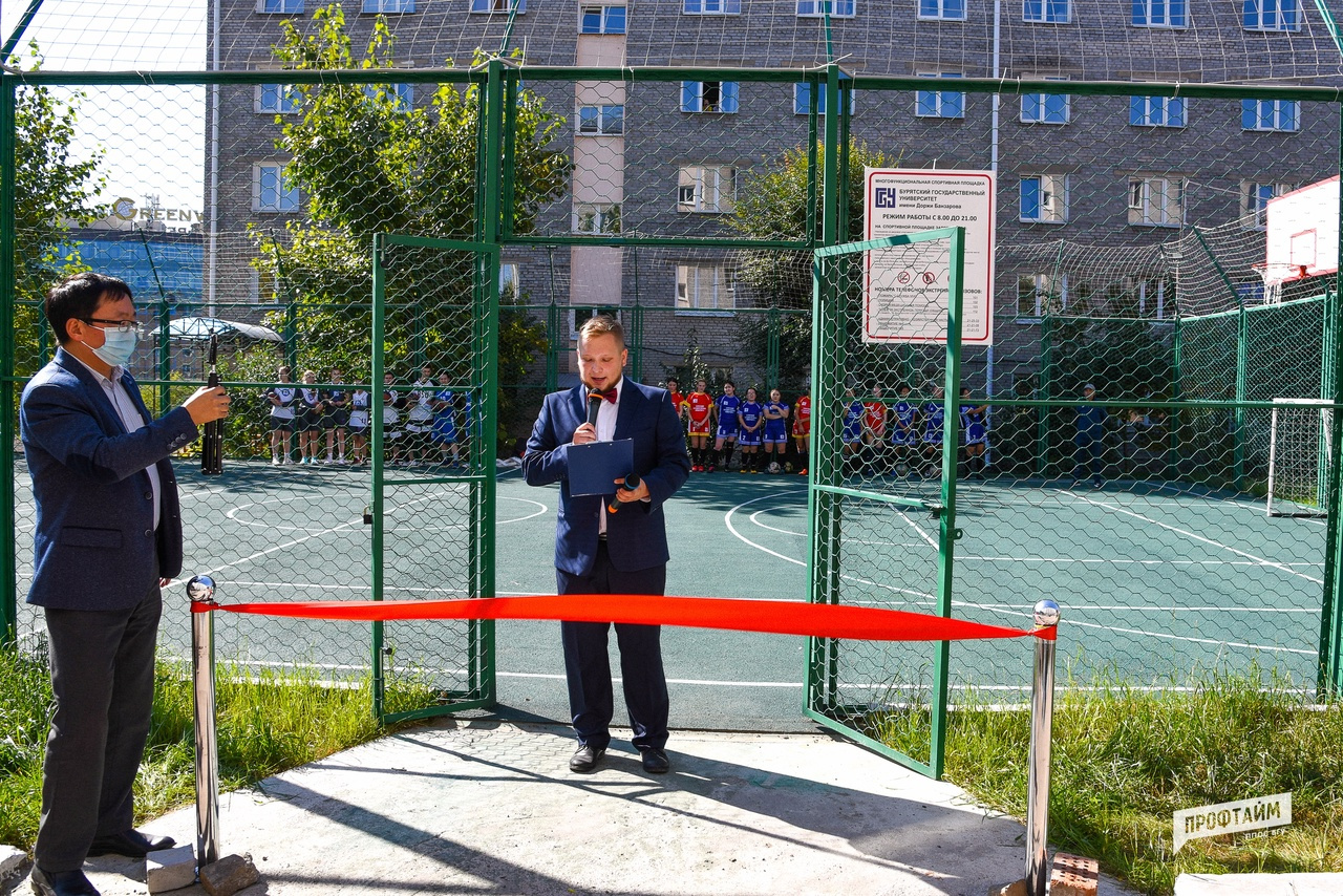 Череда праздничных мероприятий этого дня началась с торжественной церемонии открытия многофункциональной спортивной площадки (между 4 и 5 общежитиями).