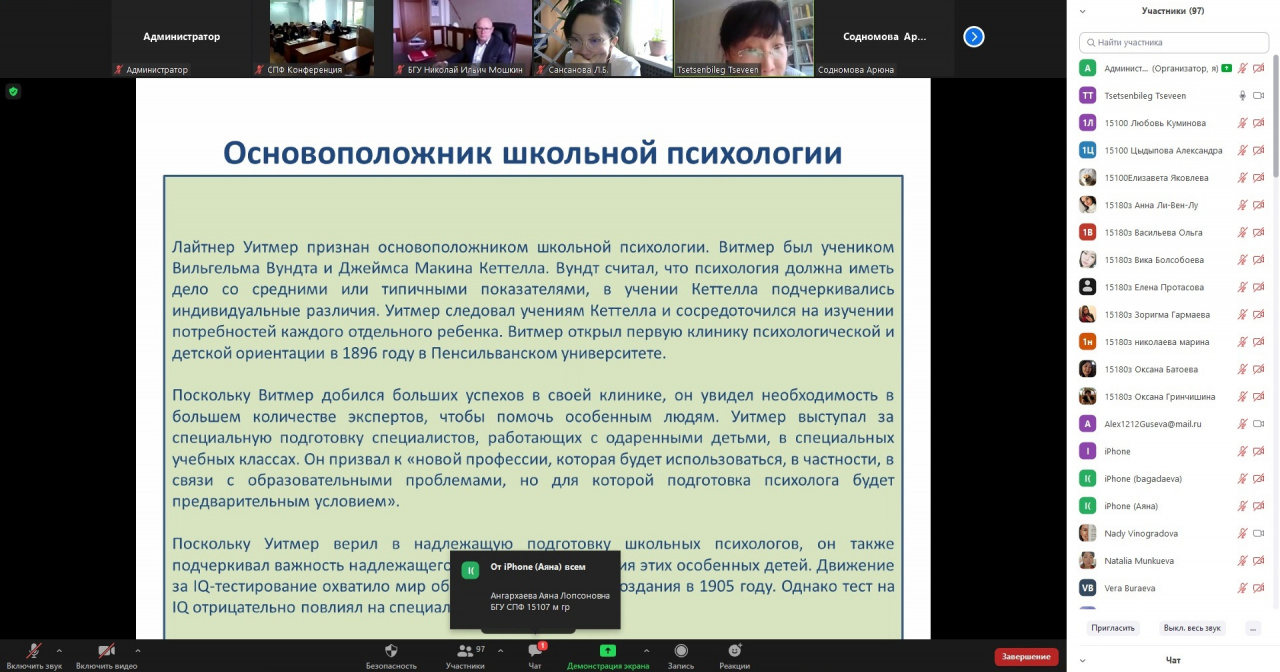 В пленарном заседании были заслушаны доклады профессора БГУ Мироновой Т.Л., Цэвээний Цэцэнбилэг - заведующая отделом социологии и социальной психологии Института Философии Академии наук Монголии, к.социол. наук, доцент Ариунбилэг Хүрэлхуу -магистр (Монголия, г.Улан-Батор), Дугарова Т.Ц. - доктор психологических наук, профессор кафедры психологии развития личности ФГБОУ ВО «МПГУ», ведущий аналитик ФГБУ «Российская академия образования» (г. Москва); Жаргалова А.А., Виноградова Н.В., учителя-логопеды логопедического центра «Лепетун», «Лепетун» (г. Санкт-Петербург); Алексей Тенчой - доктор буддийской философии, писатель, Румянцева Анна Андреевна - психолог (г. Москва); Батуева Е.Б. - преподаватель кафедры общей и социальной психологии ФГБОУ ВО «БГУ»; Антонова Н.С - кандидат социологических наук, доцент, зав. кафедрой теории социальной работы ФГБОУ ВО «БГУ»