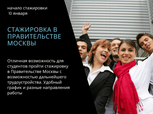 Прекрасную возможность учиться, работать и получать неплохой доход для студентов старших курсов и выпускников предлагает Правительство Москвы, приглашая пройти полугодовую стажировку. Для вас разработана программа, включающая стажировку в трех разных органах исполнительной власти под руководством наставников. Специально для студентов стажировка предполагает 20-часовую рабочую неделю с гибким графиком работы, выпускники могут выбрать полный рабочий день.
