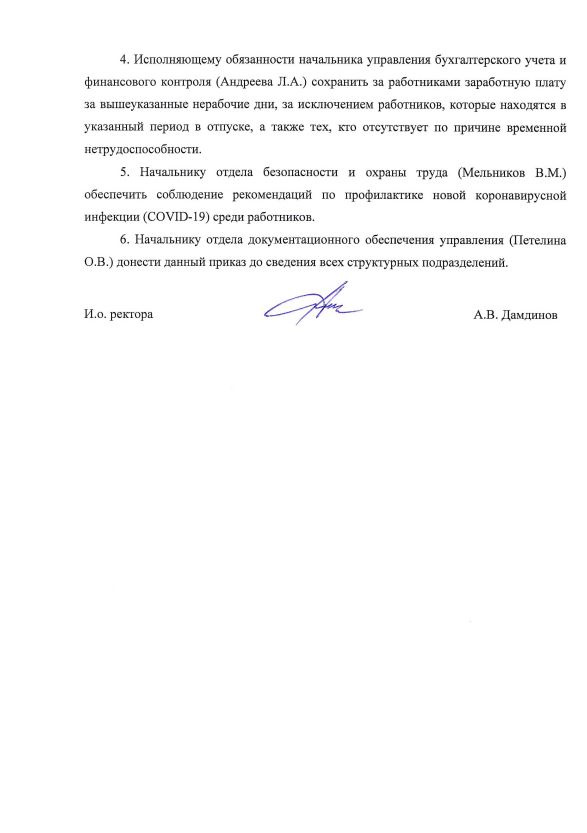 3. Главному инженеру административно-хозяйственной части (Перепечин В.В.), директору ЦИТиДО (Архипов С.В.) определить численность работников, обеспечивающих с 30.10.2021 г. по 07.11.2021 г. включительно функционирование университета.