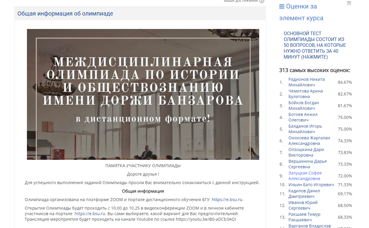 13 ноября 2021 г. на историческом факультете БГУ состоялась традиционная Междисциплинарная олимпиада по истории и обществознанию имени Доржи Банзарова, в которой приняли участие 380 учащихся 9-11 классов школ и студентов 1-4 курсов учреждений СПО.