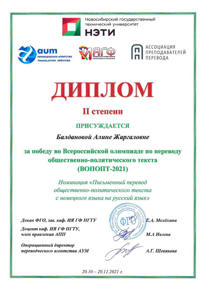 Балданова Алина, студентка гр. 18492 (направление «Перевод и переводоведение»), приняла участие во Всероссийской олимпиаде по переводу общественно-политического текста, организованной Новосибирским государственным техническим университетом при поддержке Ассоциации преподавателей перевода, и заняла 2 место в номинации «Письменный перевод общественно-политического текста с немецкого на русский».