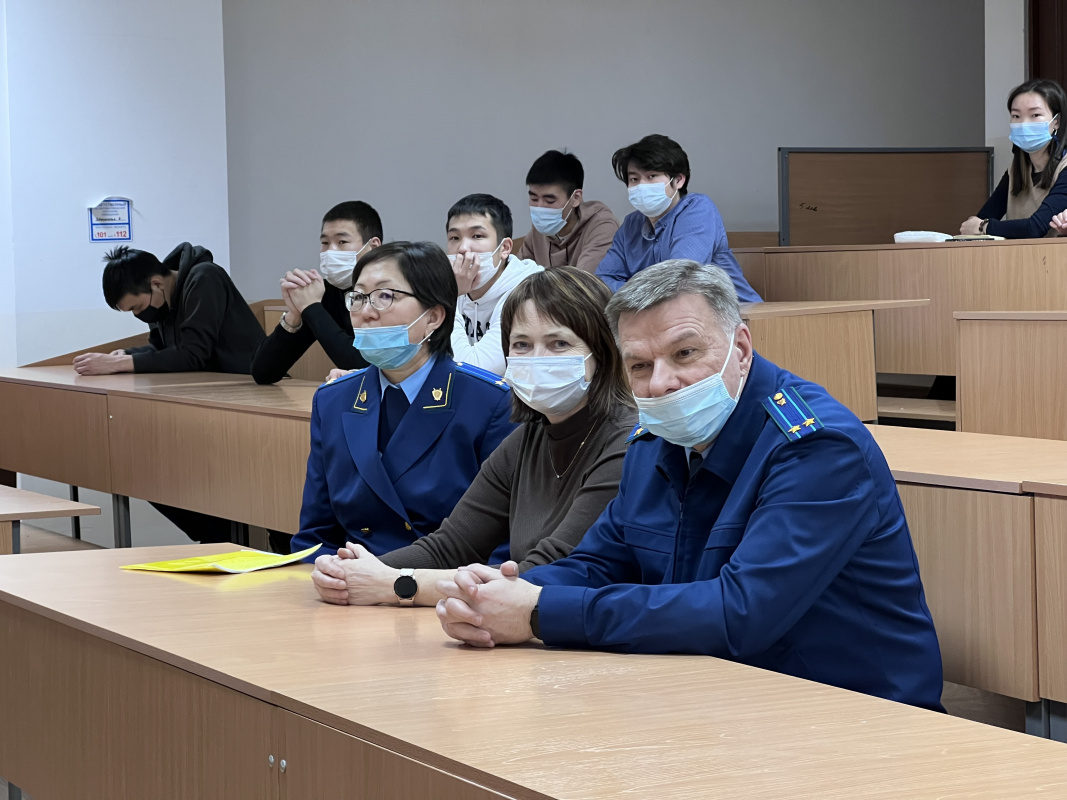 На первой встрече старший прокурор отдела кадров Прокуратуры Республики Бурятия, советник юстиции Эржена Александровна Галсанова рассказала студентам об истории создания и развития Прокуратуры в нашей Республике. Был показан фильм о деятельности данного органа на современном этапе, а также отмечен большой вклад сотрудников в укрепление законности, защиты прав и свобод человека и гражданина, защиты интересов общества и государства.