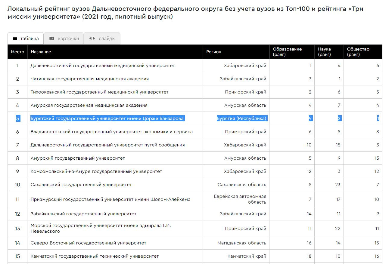 Бурятский государственный университет в локальном рейтинге вузов Дальневосточного федерального округа занимает 5-е место: по образованию БГУ на 9-м месте, по науке – на 2-м, по показателю «Общество» - на 1-м.