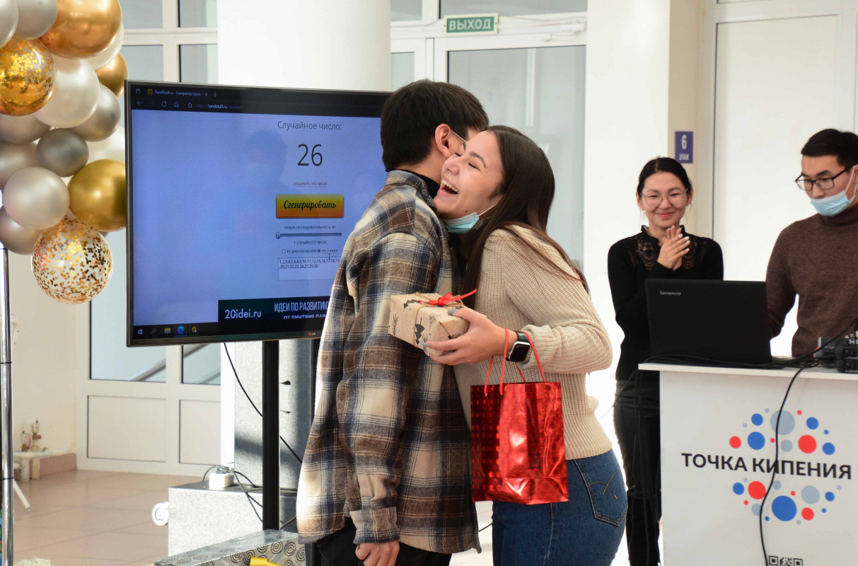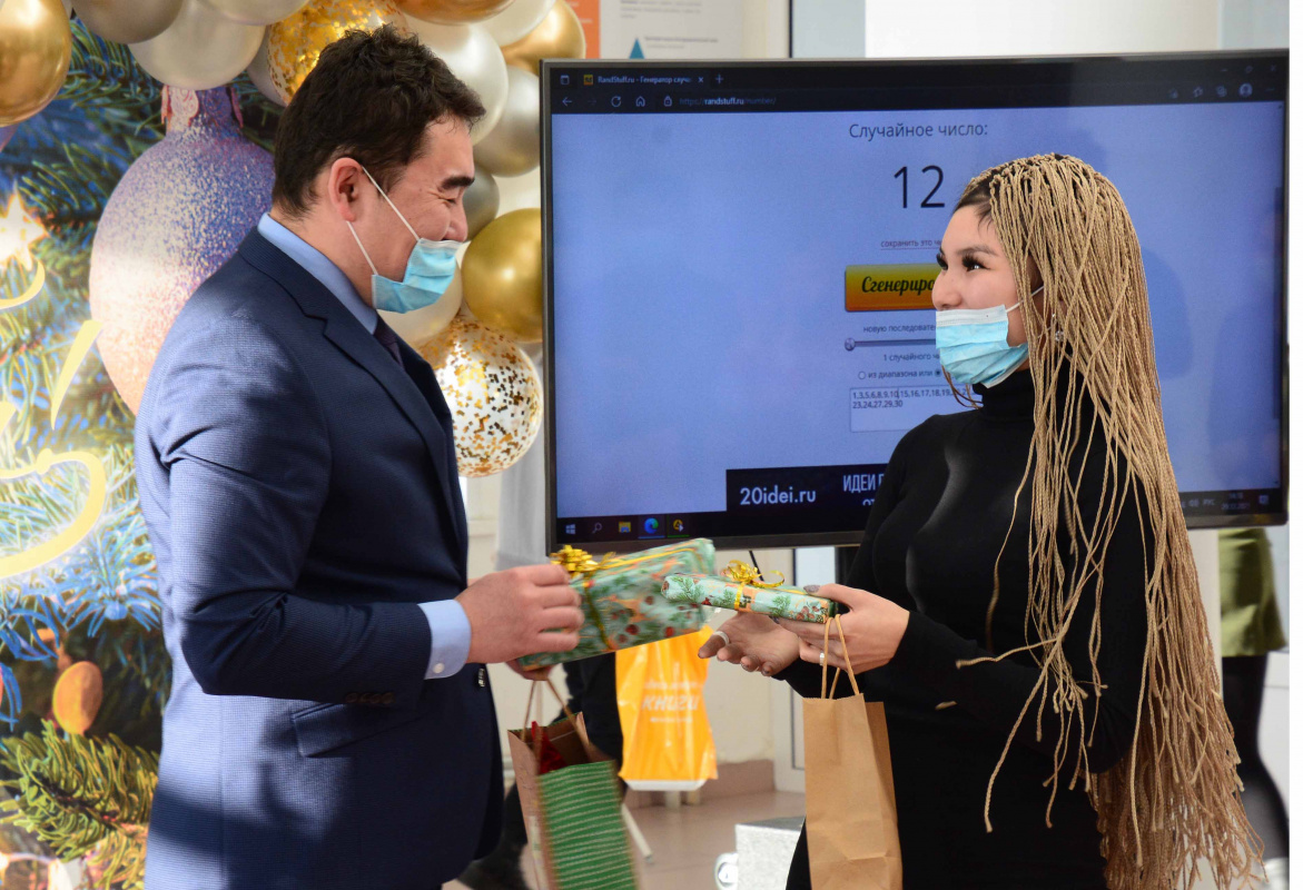 Для участия в массовой игре, участники которой выполняют роль Санта-Клауса, были приглашены лучшие студенты и руководство вуза. Организаторы на входе раздавали участникам номера, которые были загружены в программу случайного генерирования чисел. С помощью программы выбирались цифры и участники с такими номерами дарили друг другу подарки.