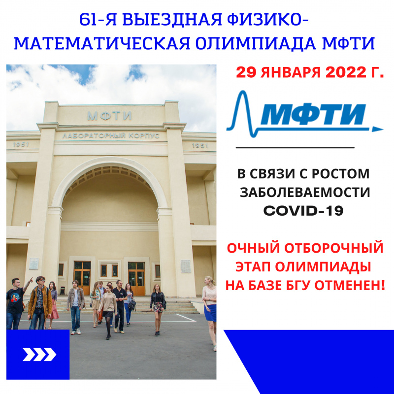 В связи с ростом заболеваемости коронавирусной инфекцией (COVID-19) в Республике Бурятия, переводом образовательных организаций на дистанционный формат обучения сообщаем, что отборочный этап 61-ой Выездной физико-математической олимпиады МФТИ 29 января 2022 г. на базе физико-технического факультета Бурятского государственного университета имени Доржи Банзарова отменен!