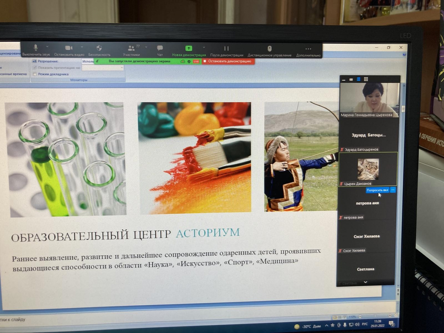 автономии татар Бурятии), выступление студентов Бурятского государственного университета имени Доржи Банзарова «90-летию Альма-матер» (Очиров А.А., заместитель декана по воспитательной работе Исторического факультета БГУ), профессорский час «Россия и Монголия: вечные соседи и надежные друзья» (Родионов В.А., д.полит.н., доцент, директор Восточного института БГУ), виртуальная экскурсия в Региональный центр выявления, поддержки, развития способностей и талантов у детей и молодежи Республики Бурятия «АСТОРИУМ» (Баганникова З.А., руководитель Центра), презентации программ Центра (Бутуханов В.А., разработчик и руководитель программ по информатике РЦОД «Асториум», руководитель «Малого инновационного предприятия ООО «МИП «Центр компетенций аддитивных технологий» ВСГУТУ, Батоцыренов Э.А., разработчик и руководитель программ по ГИС технологиям и аэромоделированию РЦОД «Асториум», секретарь БРО РГО, кандидат географических наук, научный сотрудник лаборатории ГИС Байкальского института природопользования СО РАН).