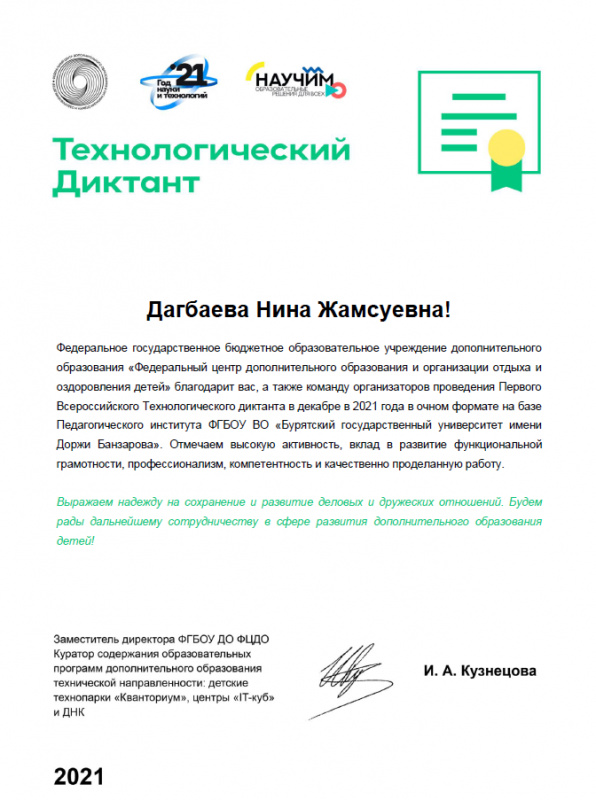 В декабре 2021 года был организован и проведен Первый очный Всероссийский Технологический диктант. Педагогический институт ФГБОУ ВО "Бурятский государственный университет имени Доржи Банзарова" являлся площадкой проведения данного мероприятия. В рамках Технологического диктанта преподавателями кафедры технологического образования и профессионального обучения была проведена профориентационная работа среди участников.