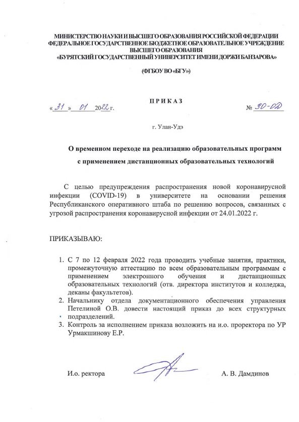 Просим ознакомиться с приказом № 30-ОД от 31.01.2022 "О временном переходе на реализацию образовательных программ с применением дистанционных образовательных технологий"