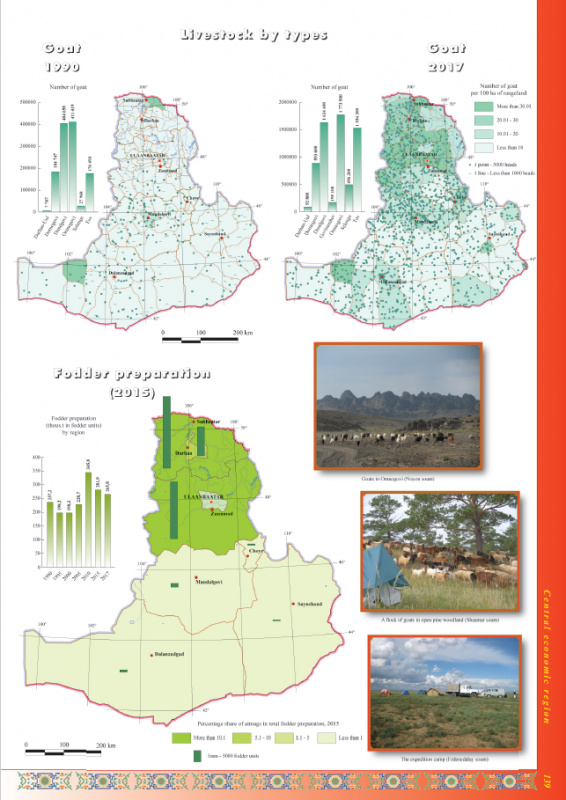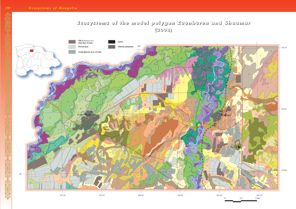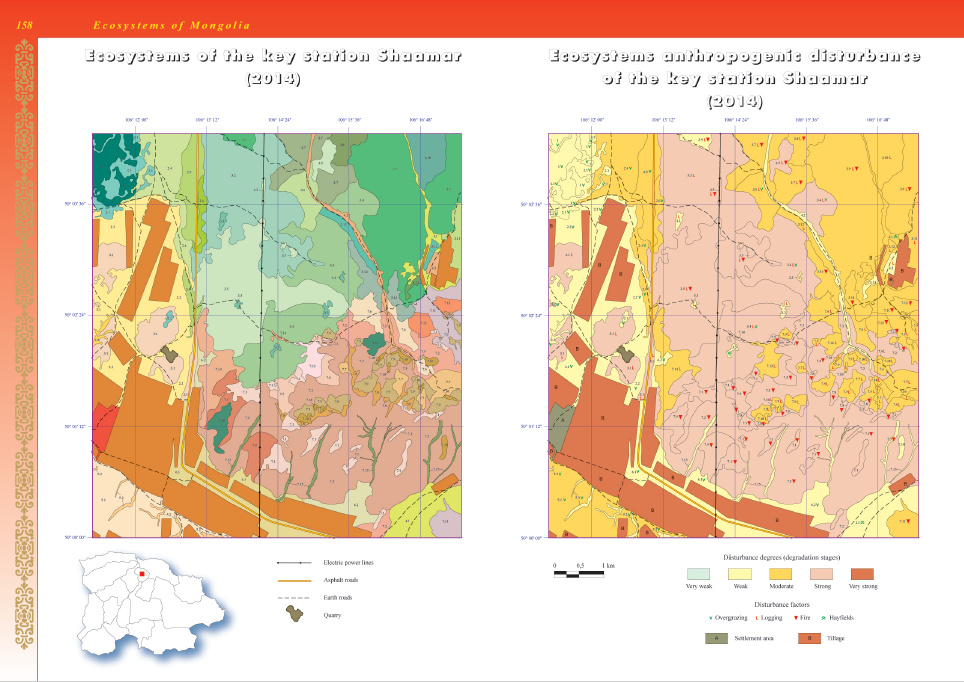 Атлас «Экосистемы Монголии» является крупным обобщающим картографическим трудом. Значительная часть карт посвящена характеристике природных экосистем страны, степени и формам их дестабилизации под воздействием антропогенных факторов. Содержательная основа атласа — это карты современной антропогенной нарушенности экосистем аймаков Монголии, разработанные в результате мониторинга состояния природных экосистем всех аймаков в период с 2010 по 2015 г. и изучения состояния экосистем отдельных сомонов и других модельных территорий.