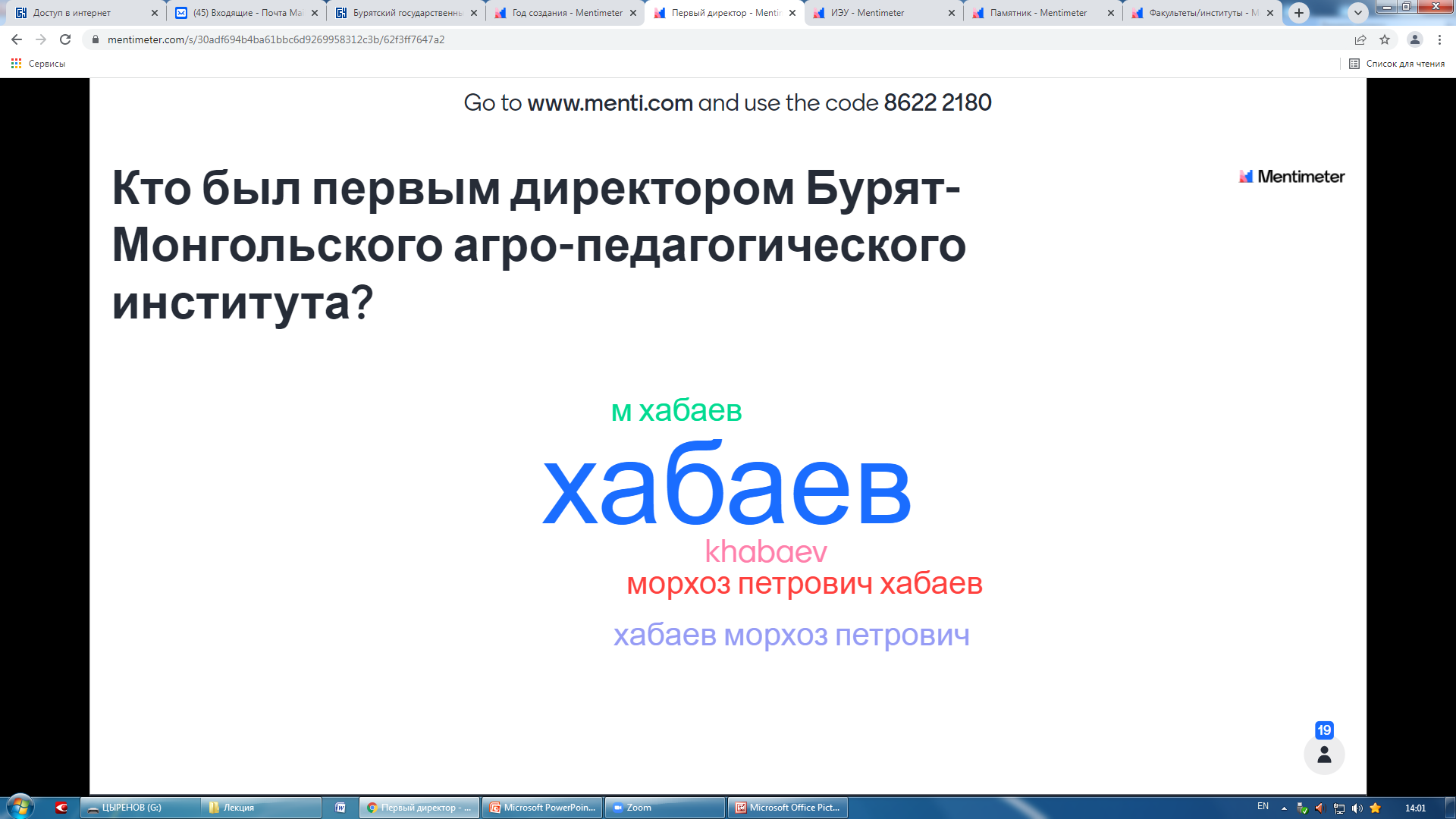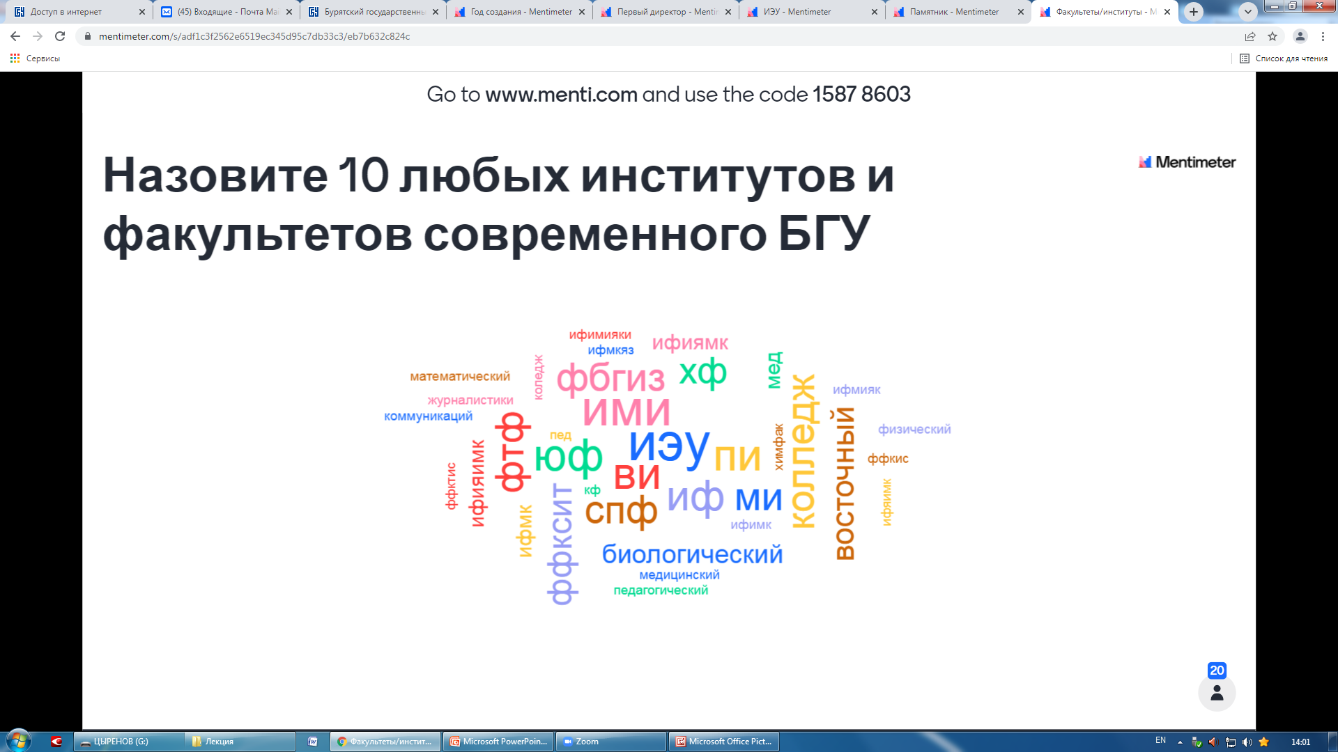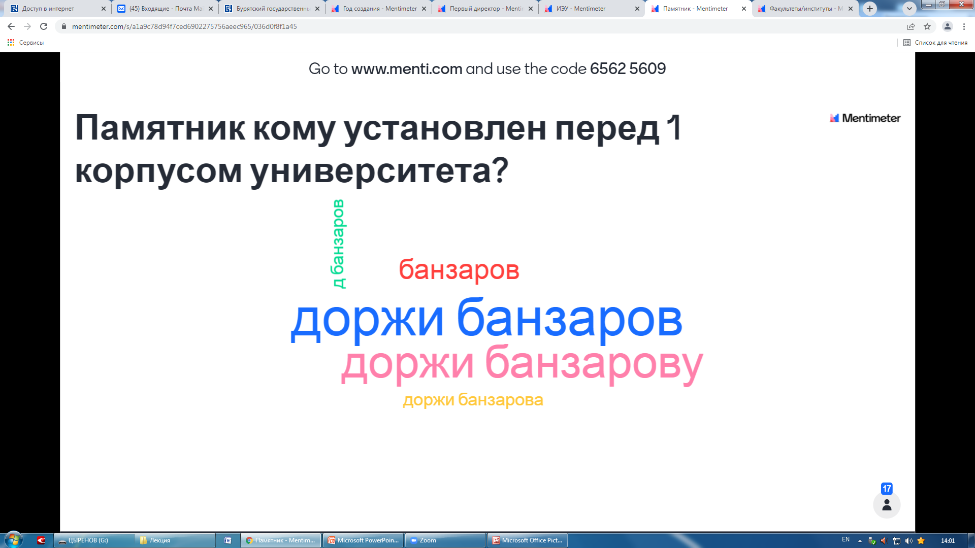 Затем заместитель директора института Д.Д. Цыренов провел небольшую викторину с использованием современных инструментов онлайн-опросов в режиме реального времени Mentimeter.com. Данная платформа позволяет задавать вопросы и получать мгновенную обратную связь через любые мобильные устройства, имеющие доступ в Интернет. Использование интерактивных методов традиционно активизирует познавательную деятельность обучающихся.