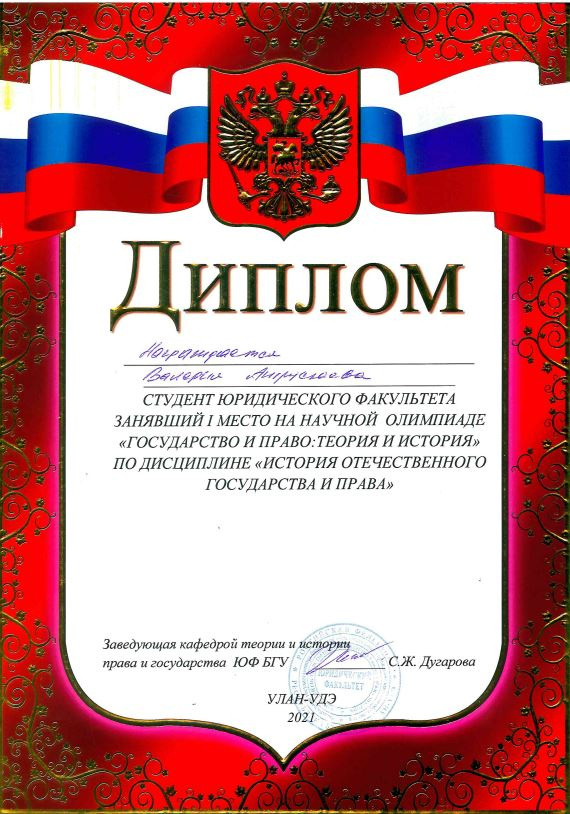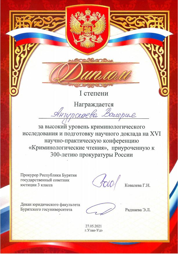 - Свой первый опыт написания научных работ я получила еще будучи на первом курсе. Помню, что тема статьи, которая должна была быть опубликована в сборнике, меня воодушевила с самого начала. Потом долгие часы работы, и наконец статья была готова. Руководителем, который стал моим проводником в научный мир, является доктор исторических наук, доцент кафедры Теории и истории права и государства, Дугарова Сержена Жигмытовна. Именно благодаря ее профессиональной поддержке моей первой пробы пера я поняла, что на самом деле при желании научный мир не так уж и далек, он по своему интересен и самое главное, ценен, причем не только в теоретическом, но и в практическом аспектах. Потом это во многом мне помогало понимать значение своих научных работ, за что я бы хотела выразить особую благодарность Сержене Жигмытовне.
