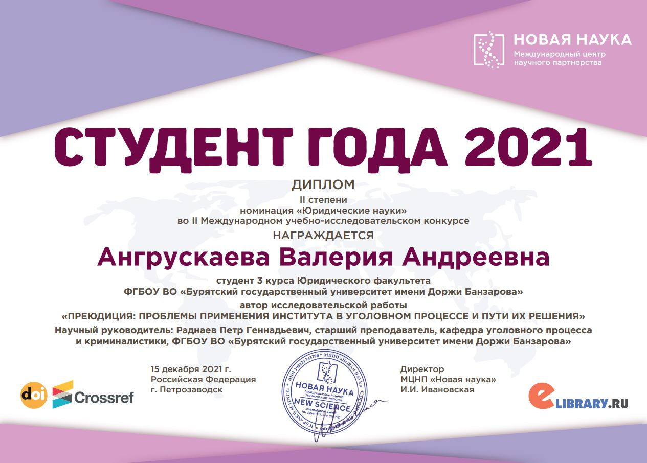 - Студент года, как это видно из названия, - традиционное ежегодное мероприятие, в котором могут принять участие все студенты не только российских вузов, но и вузов ближнего зарубежья, в силу чего конкурс имеет статус международного научного мероприятия. На конкурс претенденты отправляют одну или несколько своих статей, к которым предъявляются требования по оригинальности, оформлению, научной ценности. По итогам оценивания студент может получить диплом I, II, III степени или же только сертификат об участии. В 2021 году я отправляла на конкурс 3 научных статьи, две из которых заняли первое место, а одна – второе. Получить признание в международном конкурсе на самом деле здорово, в первую очередь для меня это возможность проверить себя, свои навыки в другой среде, где есть немалая конкуренция и где предъявляются довольно строгие требования к качеству предъявляемых работ. В любом случае я была рада, что мои работы были оценены экспертным жюри по достоинству.