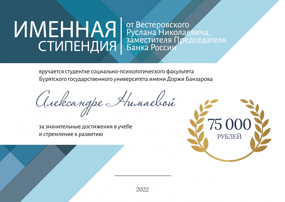 Одна из студенток СПФ Александра Нимаева недавно одержала победу в Конкурсе на именную стипендию Р.Н. Вестеровского Выпускник Социально-психологического факультета (специальность «Социальная работа»), заместитель Председателя Центрального банка Российской Федерации Руслан Николаевич Вестеровский в 2008-м г. учредил свою стипендию, которую имеет возможность получить лучший студент, обучающийся по направлению подготовки 39.03.02 «Социальная работа», за достижения в научно-исследовательской, учебной, общественной деятельности, размер стипендии составляет 75 тысяч рублей.