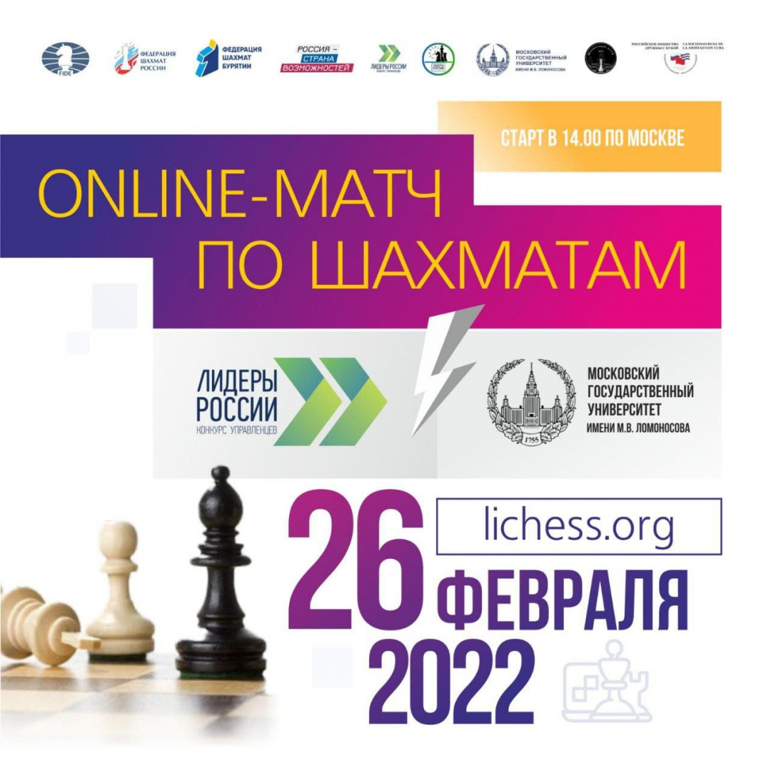 26 февраля 2022 года в 14 часов по московскому времени состоится онлайн-матч по шахматам между командами «Лидеры России» и Московского государственного университета им.М.В. Ломоносова.