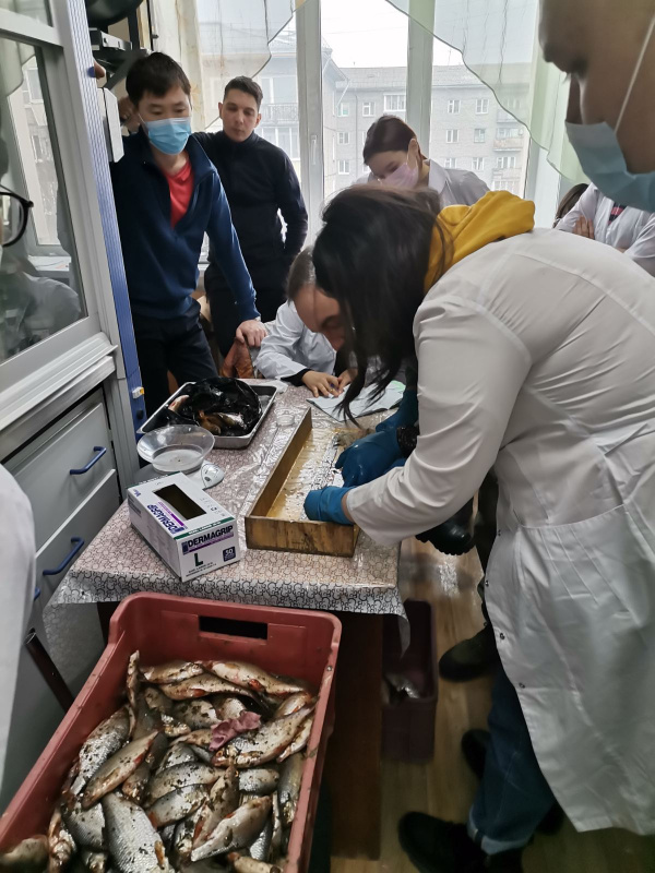 Экскурсию по лабораториям провел наш выпускник Кожемякин Кирилл Михайлович – старший специалист лаборатории водных биоресурсов. Нам было подробно рассказано о структуре, работе и функционале организации. Студентам была дана возможность окунуться в атмосферу рабочего момента, при разборе очередного мониторингового улова рыбы из Байкала. Кирилл Михайлович подробно объяснял, зачем и для чего производятся такие выловы рыбы. На что необходимо обратить внимание при регистрации и записи данных. Некоторые студенты попробовали себя в роли сотрудников и поучаствовали при вскрытии некоторой части отловленной рыбы. При этом фиксировали пол, массу тела, половозрелость особей, жирность и наполнение кишечника. Брали образцы чешуи для определения возраста рыбы в дальнейшем.
