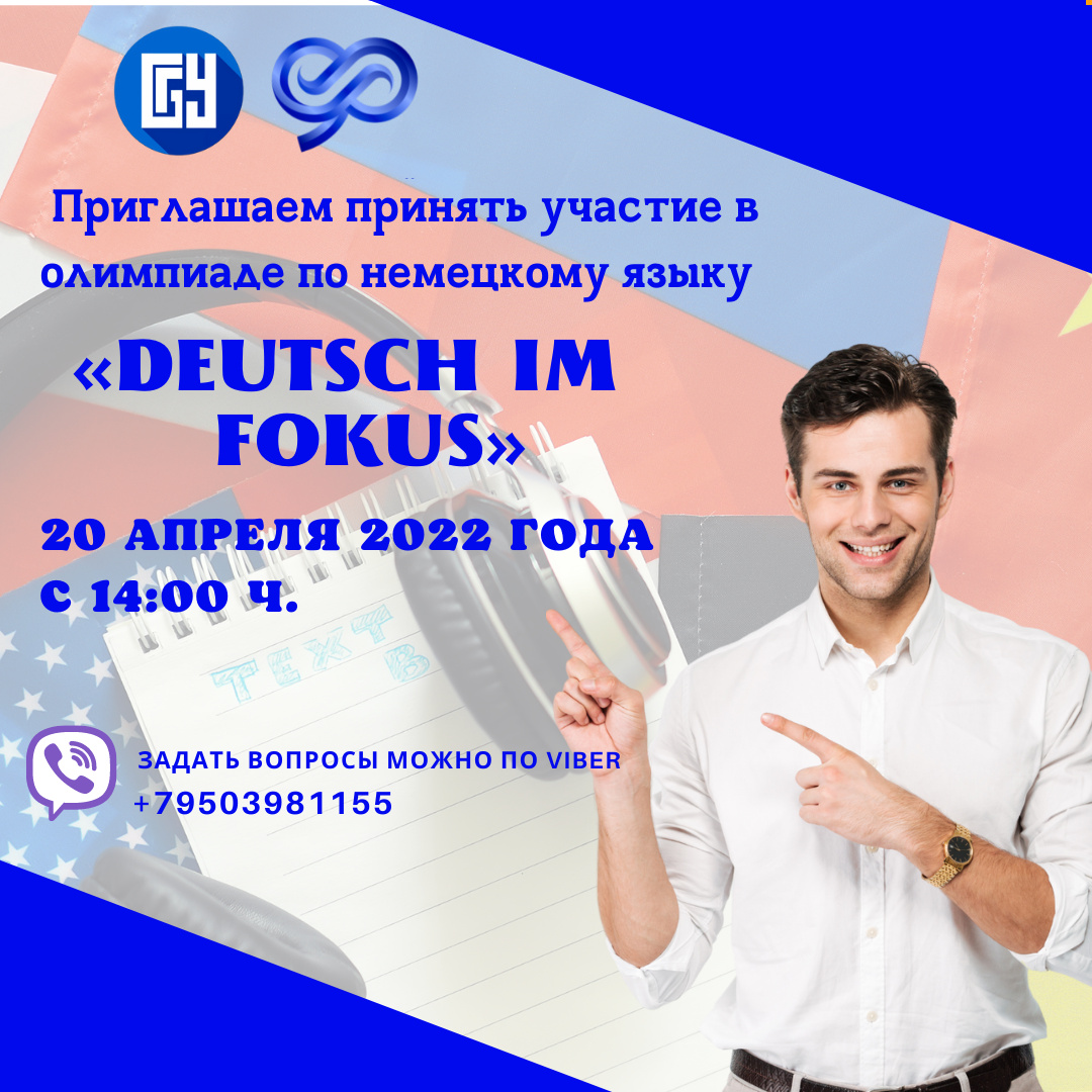 Кафедра немецкого и французского языков Института филологии, иностранных языков и массовых коммуникаций БГУ приглашает учащихся 10-11 классов школ, а также обучающихся СПО к участию в онлайн-олимпиаде по немецкому языку «Deutsch im Fokus» 20 апреля 2022 г. в 14.00.