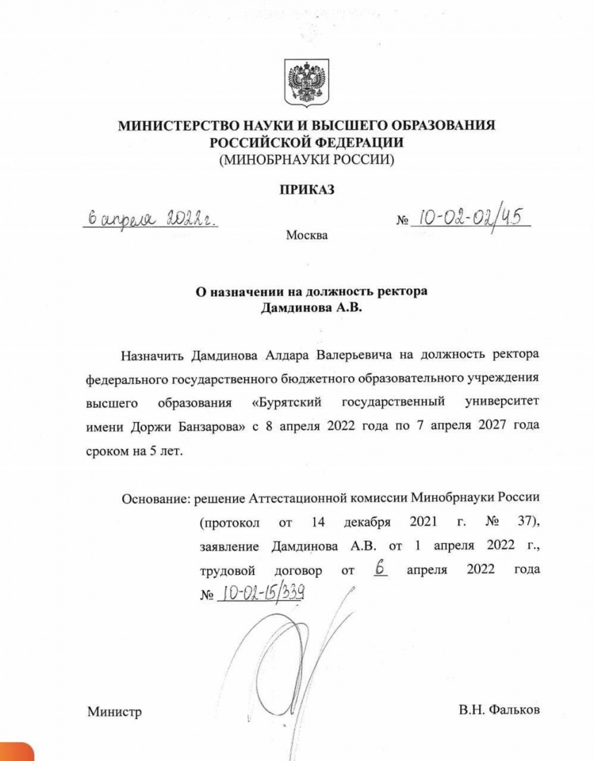 6 апреля министр науки и высшего образования РФ В. Н. Фальков подписал приказ о назначении Алдара Валерьевича Дамдинова на должность ректора Бурятского государственного университета имени Доржи Банзарова с 8 апреля 2022 года.